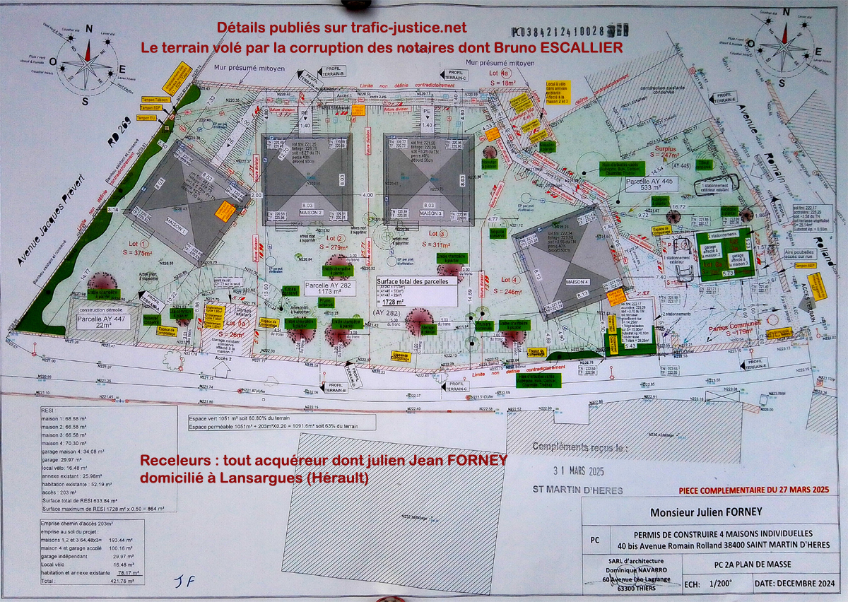 Le bien immobilier (avec le terrain) a été pillé par la corruption du notaire Bruno ESCALLIER. La procédure pénale est en cours comme vous pouvez le constater sur le document joint du juge d'instruction Victoria BOUSSARD (Tribunal judiciaire, Palais de Justice de Grenoble, Pl. Firmin Gautier, 38000 Grenoble)