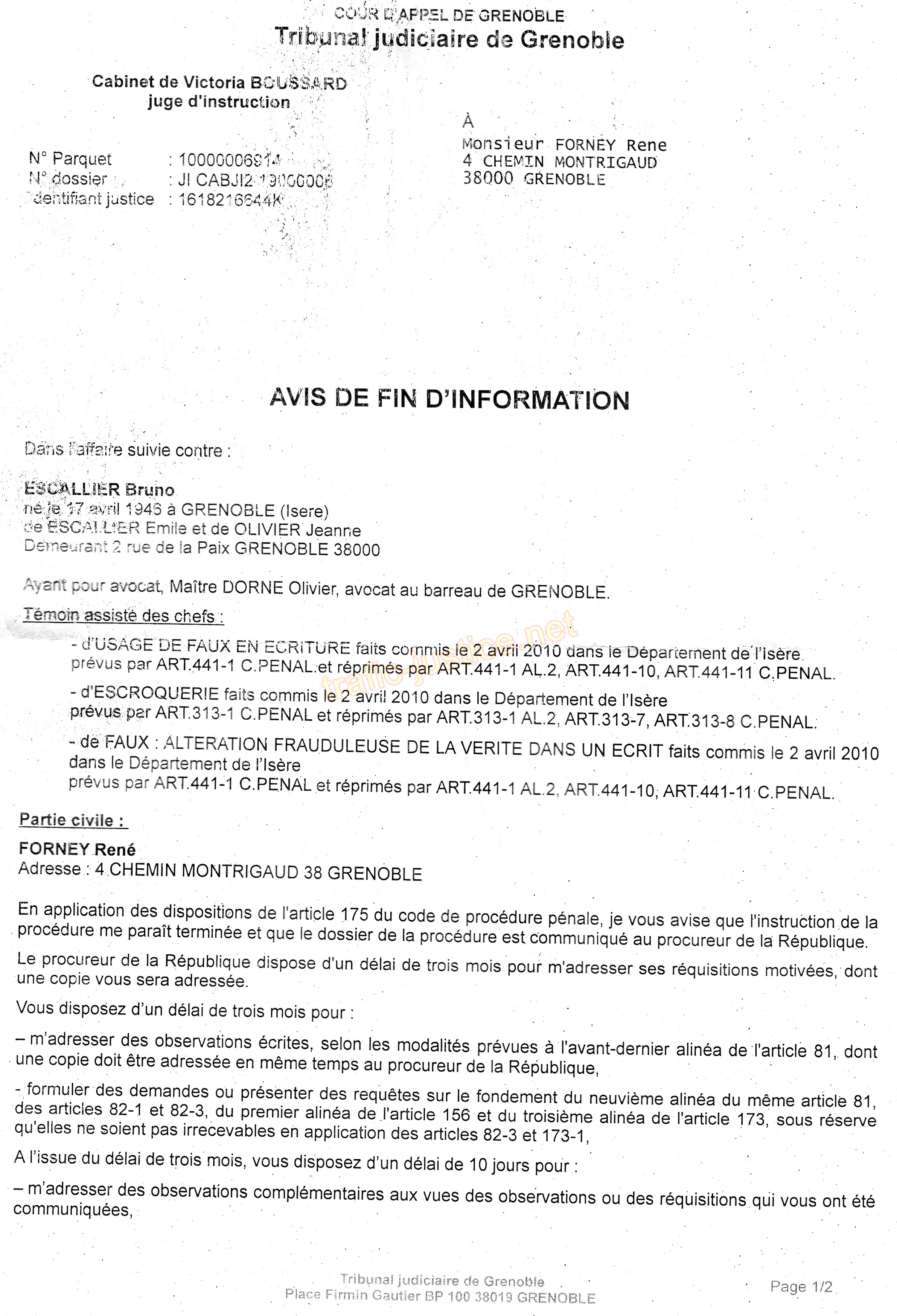 Crime de faux du notaire Bruno ESCALLIER demeurant 2 rue de la Paix Grenoble (et complicités) assisté de l'avocat Olivier DORNE de la SCP MONTOYA