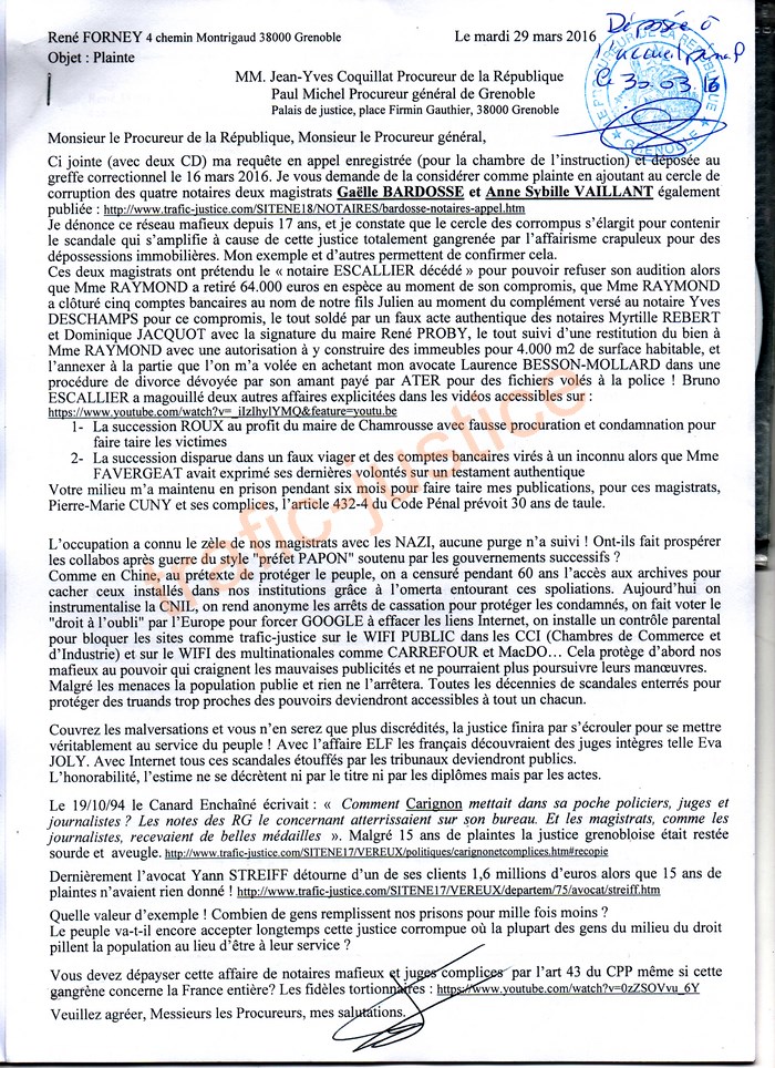 Ci jointe (avec deux CD) ma requête en appel enregistrée (pour la chambre de l'instruction) et déposée au greffe correctionnel le 16 mars 2016. Je vous demande de la considérer comme plainte en ajoutant au cercle de corruption des quatre notaires deux magistrats Gaëlle BARDOSSE et Anne Sybille VAILLANT également publiée : https://www.trafic-justice.com/SITENE18/NOTAIRES/bardosse-notaires-appel.htm