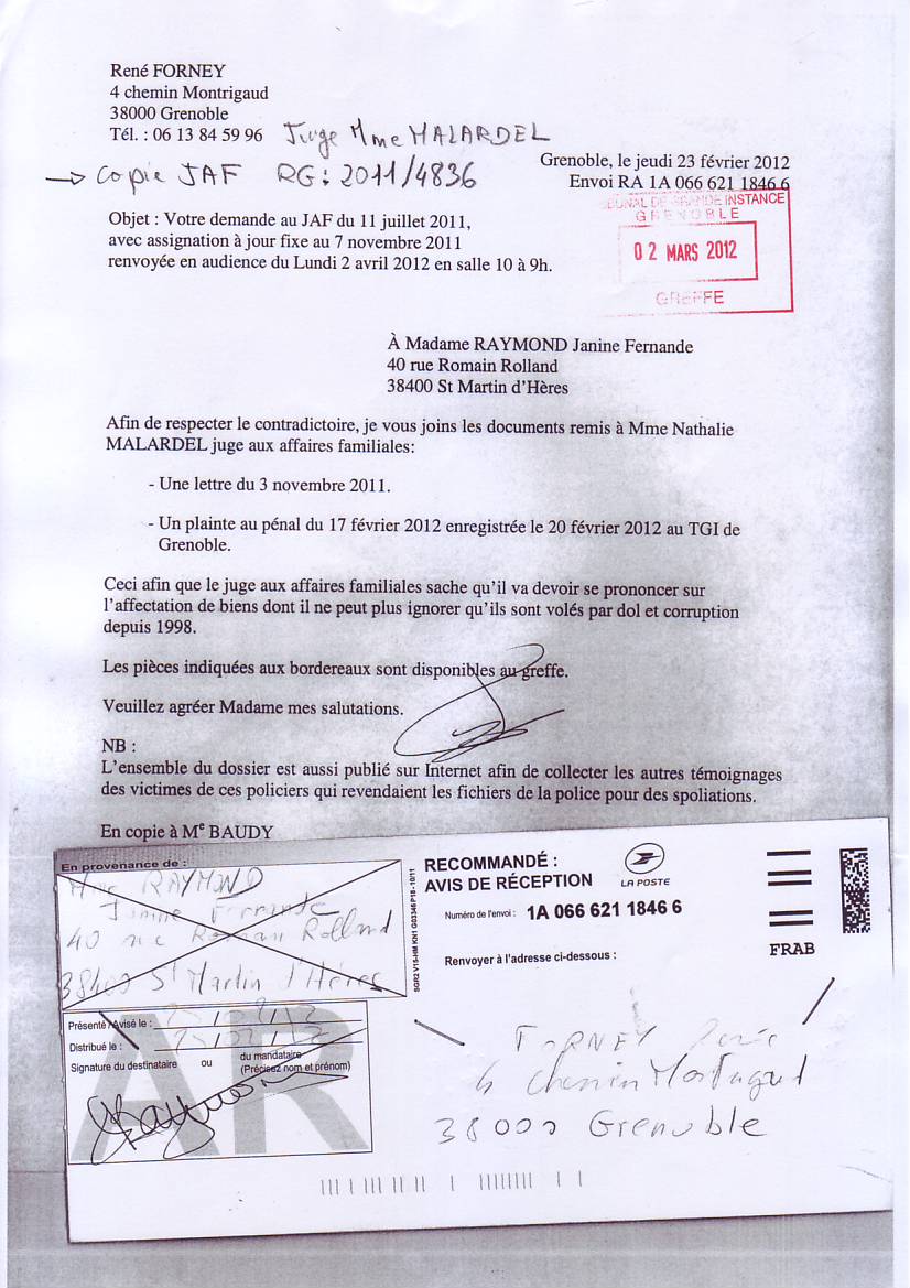 Monsieur FORNEY René , né le 5/11/54 à Nîmes - 4 chemin Montrigaud, 38000 Grenoble PLAINTE à Monsieur le Procureur de la République A- MOTIFS DE LA PLAINTE : Plainte également contre X pour complicité Ces quatre juges ont prononcé un partage par jugements et arrêts du 6/11/08 (pièce 201) et 26/10/10 (p.202) de sorte qu'il ne me reste rien d'un million d'euros de biens en valeur 1998. La charge de la preuve m'incombe. Malgré mes conclusions du 26 avril 2010 accompagnées de 109 pièces , ainsi, les quatre juges : ** ont attribué sans la moindre compensation ma maison et terrain à la partie adverse (p. 84 à 86, 105) acquis sur mes fonds propres (p. 19, 50, 51, 79, 88, 89) ** ont laissé les profits des locations de l'appartement de la communauté à Mme Janine Fernande RAYMOND (ex-épouse) qui en exige l'attribution en pleine propriété (p. 203) ** m'ont affecté des dettes inopportunes de telle sorte que je sois dépossédé ensuite de l'appartement devenu mon domicile depuis l'expulsion illégale de ma maison le 6/12/98 ** m'ont refusé la possibilité de savoir le contenu de multiples comptes bancaires dont ceux ouverts sous le nom de mon fils Julien (p.58) avant sa majorité (aujourd'hui âgé de 28 ans) sur lesquels ont transité 200.000 € des fonds recélés de la communauté (p. 2 à 5) ** avaient les preuves que Mme RAYMOND (délivrant les permis de construire à la ville d'Échirolles en 98) a obtenu son divorce par trafics d'influences, corruption, dol avec l'appui des relations de Paul Maurice GIRAUD son amant de 94 à 2003 (p. 12 à 14, 204) ex policier. ** savaient que depuis 98 le détournement des avoirs bancaires par mon ex-épouse a ruiné ma reconversion dans l'immobilier comme indiquée dans les témoignages (p. 69, 205 à 207) ** savaient, qu'à cause de ces trafics, je suis désormais au RSA (p. 6, 68) et cela depuis 2000. ** pouvaient-ils ignorer que dans la métallurgie les plans sociaux ont mis en préretraite les personnes atteignant 50 ans et que j'ai 57 ans actuellement ? Pourquoi autant d'acharnement et de protections ? Aux tribunaux de Grenoble, Lyon, Paris, j'ai prouvé que GIRAUD amant de mon ex épouse vendait des fichiers volés à la police avec neuf associés (p.11) Henri MARGAILLAN, Yves CAMPANA, Pierre CHARLON, Bruno CWIKOWSKI, Jacques PREVOST… initialement en fonction dans la police. Grâce à cette activité illicite très lucrative (600.000 € encaissés en 17 mois p. 34) ces "escrocs" ont permis à GIRAUD d'étendre sa corruption aux participants à mon divorce imposé sans que je puisse produire initialement les pièces de ma défense. Le rapport de détective LALLEMENT (p. 13) ne laisse aucun doute sur la relation adultère entre GIRAUD / RAYMOND ex épouse FORNEY. M. PATTORET, nouveau compagnon de mon ex épouse, témoigne d'ailleurs que tous deux étaient invités chez GIRAUD (p.11) l'ex-amant de mon ex-épouse, encore en 2008 (p. 208). Curieusement mes avocats n'ont pas produit le rapport Plainte détournement de biens facilités par des magistrats des chambres civiles de Grenoble – 17 février 2012 Page 1 /13 LALLEMENT (p. 13) lors du divorce mais les juges du partage l'avaient, et connaissaient les falsifications de jugements utilisées initialement. B - DISCUSSION 1 – Les quatre juges du partage savaient le conflit d'intérêt entre les personnes ** Dès 2000, les ex-policiers en cause de Grenoble s'étaient associés dans la même société (CPS) Centaurées Protections Sécurités (p.11, 25) dont Henri MARGAILLAN était le gérant. Des personnes de cette société étaient déjà lourdement condamnées (p. 23, 24). ** À l'adresse de l'étude au 5 av Médecin G. Viallet à St Egrève les notaires DESCHAMPS Yves et Nicolas partagerait une villa (p. 45) avec Yves CAMPANA ancien policier en société aussi dans CPS (p. 11) et l es juges ont pu lire sur la photo (p. 45) des boîtes aux lettres (hasard ?) :