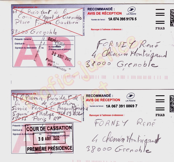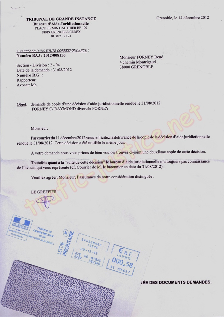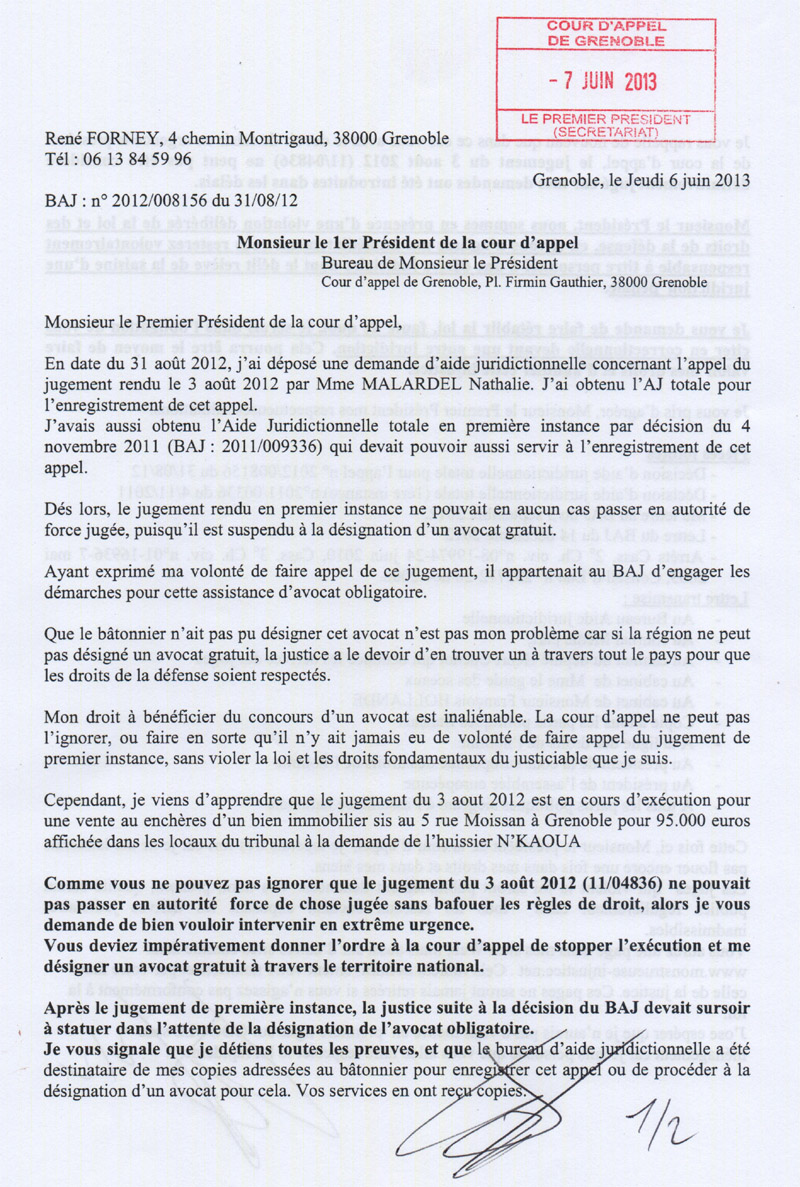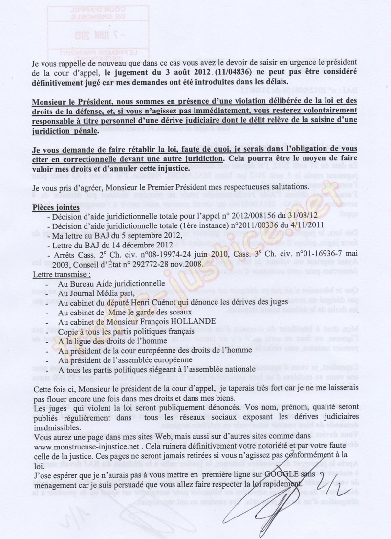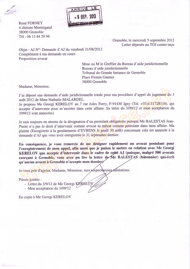 13 cours Jean JAURES, 38000 Grenoble, En copies : Me BALESTAS et cour d'appel de Grenoble