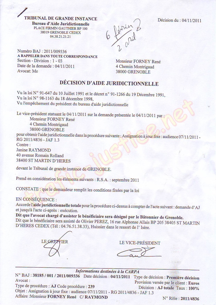 - Décision d'aide juridict. totale n°2011/00336-4/11/2011, et, pour l'appel n° 2012/008156-31/08/12 et 14/12/12.