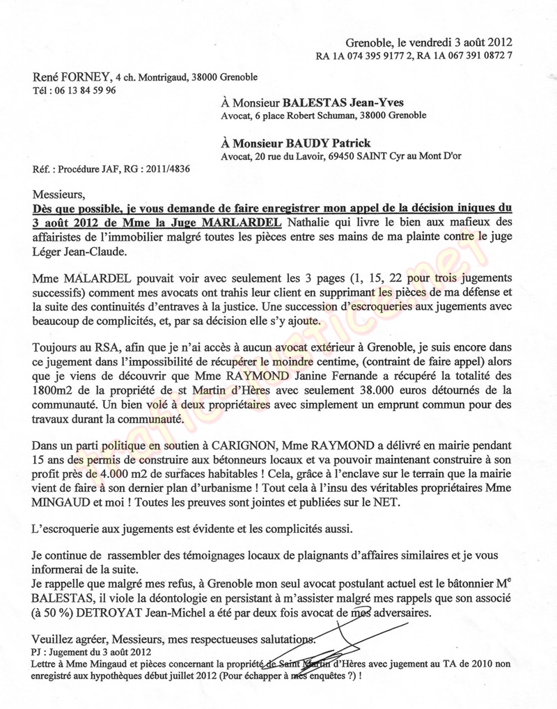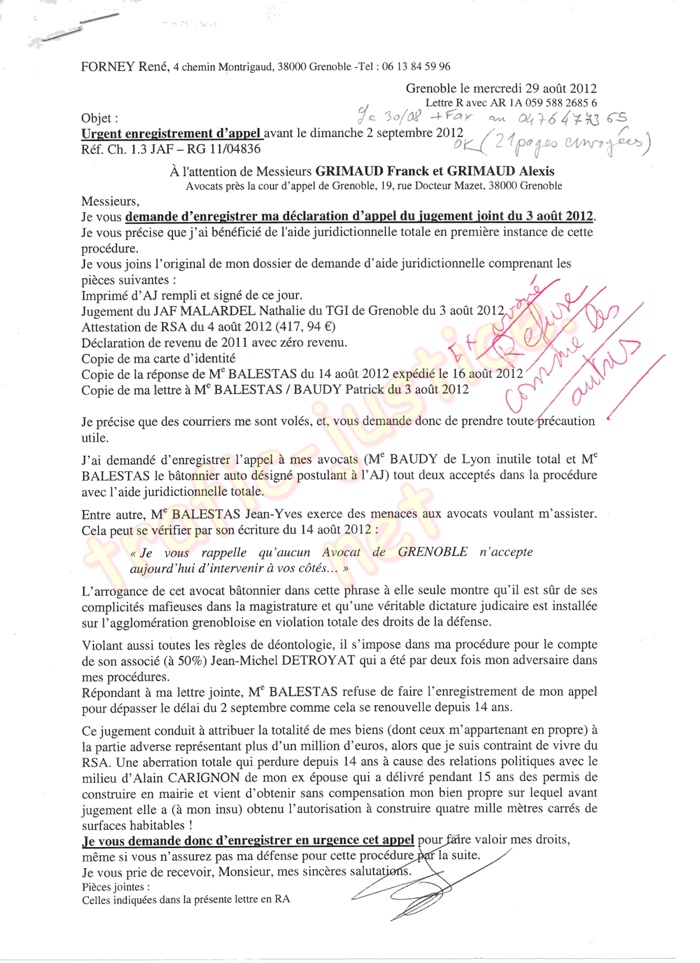 - Ma lettre du 3 août 2012 à Me BAUDY Patrick / BALESTAS Jean-Yves demandant d'enregistrer l'appel.