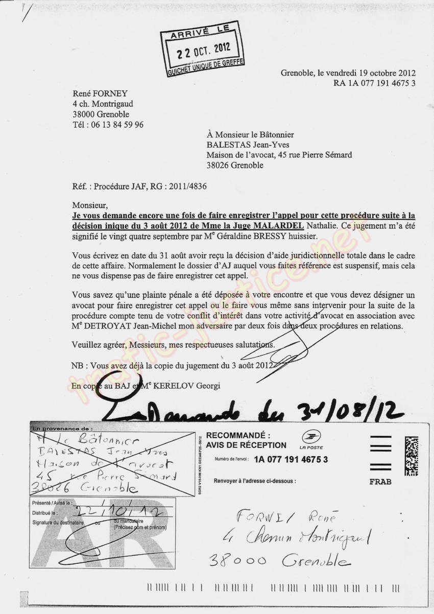 - Ma lettre du 19 oct. 2012 à BALESTAS Jean-Yves demandant d'enregistrer l'appel.