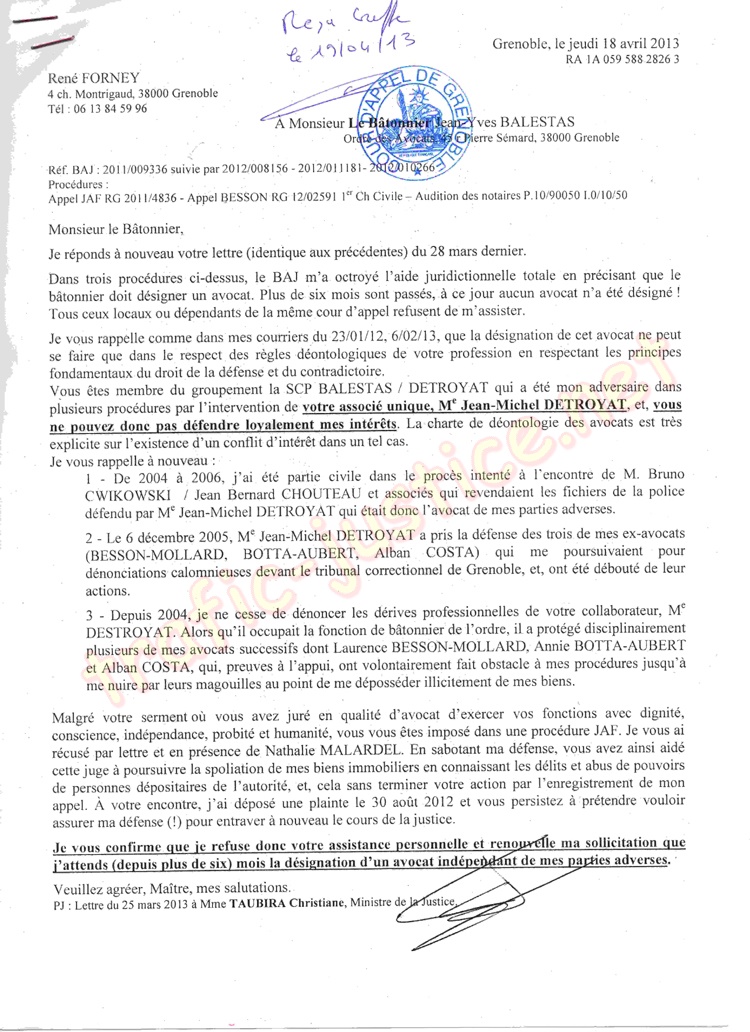 PJ : - Lettres de récusation à Me BALESTAS du 18 avril 2013, n° 410 du 23/01/12 et 30/01/12 .