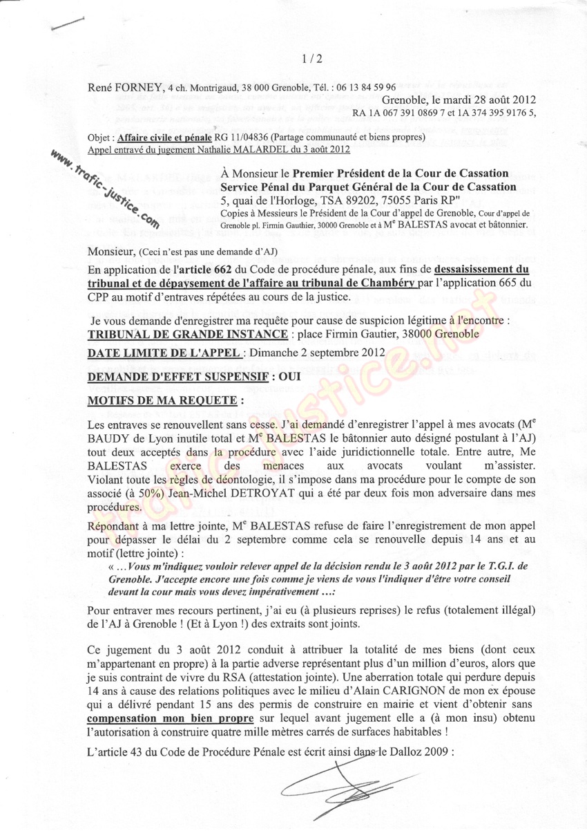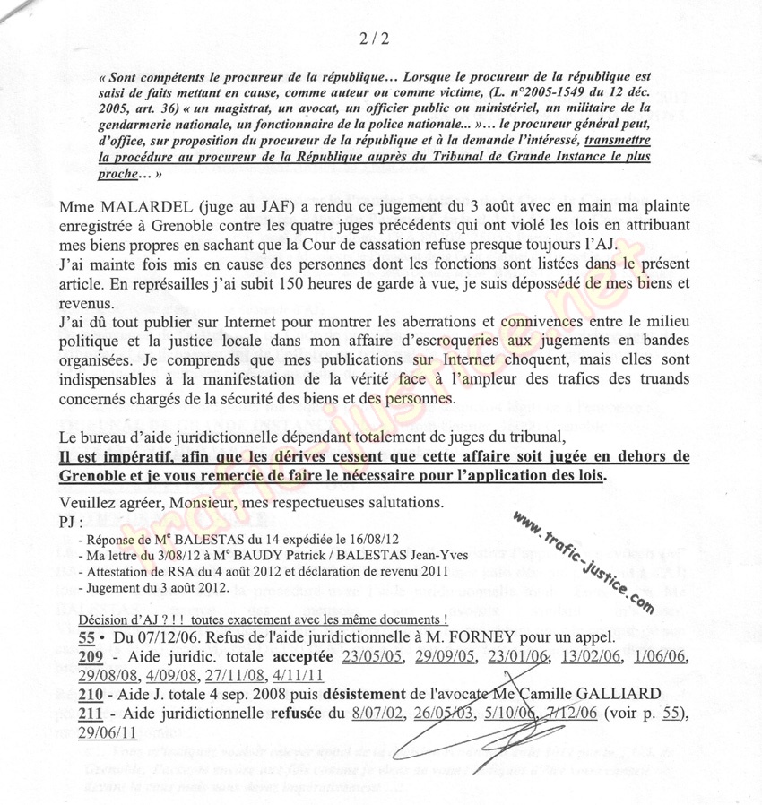- Par l'illégalité du jugement du 3 août 2012 d'une juge corrompue MALARDEL Nathalie qui connaissait les malversations à l'origine de cette procédure, et, ma récusation de BALESTAS présent.