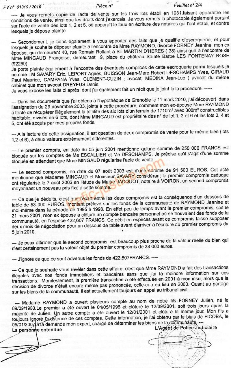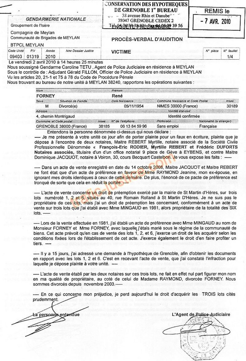 | Découvert fin mars 2010 ! Deux avocats Jean-Luc MEDINA et CLEMENT-CUZIN à la solde de Mme RAYMOND Janine (ex FORNEY) demandent aux juges la régularisation d'une vente en justifiant d'une solution pour se passer de la signature de l'ex conjoint propriétaire et copropriétaire (FORNEY René). Deux notaires REBERT Myrtille et JACQUOT Dominique font un faux acte de vente le 14 octobre 2008 destiné à la mairie de St Martin d'Hères qui a préempté en choisissant le compromis à 38.000 € à la place du second de 91.500 € en oubliant comme le vendeur Mme MINGAUD Françoise les droits du principal copropriétaire.
