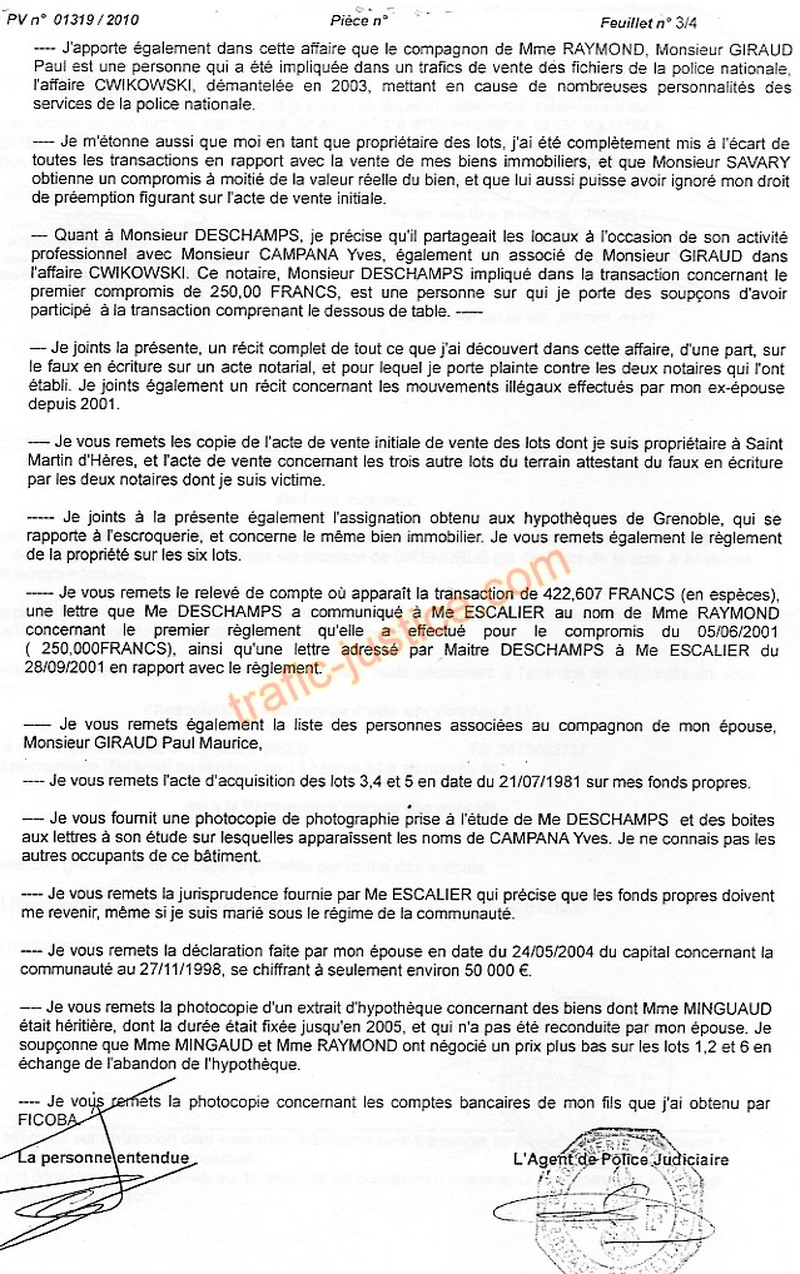 . Qui a récupéré le dessous de table de plus de 83.000 € (valeur 2019) appartenant à la communauté FORNEY / RAYMOND (toujours en juin 2010 - appel en cours) lors de transactions organisées par le notaire Yves DESCHAMPS (et Nicolas son fils ) On est ici en confrontation avec plus de trois notaires escrocs qui ont fait un faux (Les assises ?) pour la cession d'un bien d'autrui en omettant volontairement de rechercher le copropriétaire spolié : René FORNEY