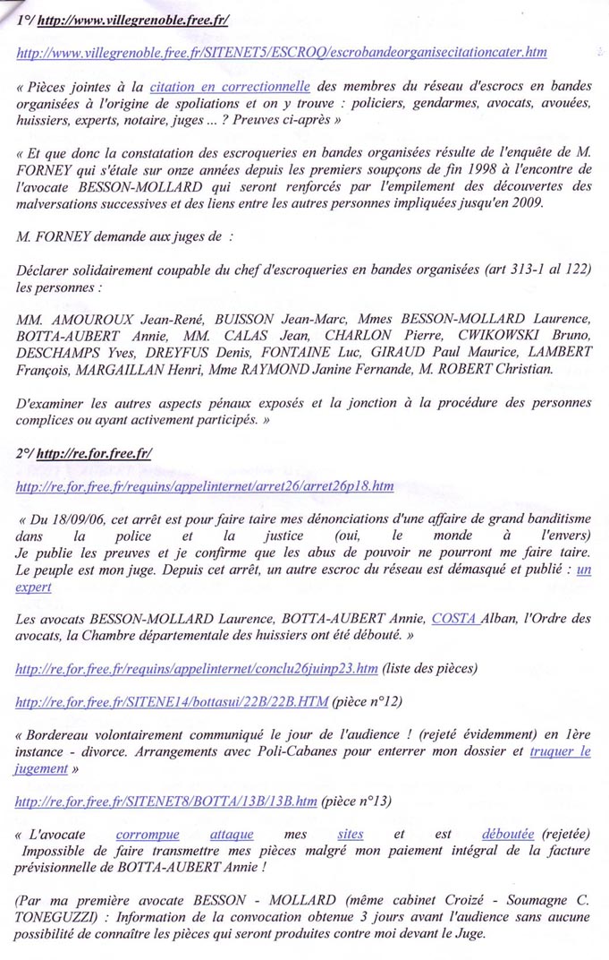 Monsieur, J'ai reçu de FREE une copie datée du 29/08/11 de votre action pour exiger la fermeture de pages de contenus repris de mes sites Internet. Votre action en l'absence de tout jugement est abusive. Je vous mets en demeure d'informer dès réception les hébergeurs de votre erreur . Je vous joins en copie quelques documents qui prouvent ce que je dénonce (ils sont en ligne) : En 2006, ces trois avocats traitres trop zélés ont été débouté en ces termes : Vous connaissez cette affaire puisque en 2010 vous avez, personnellement, exigé et obtenue une consignation élevée pour qu'elle ne soit pas jugée devant le tribunal de Paris. Les dénonciations publiées, en cause, sont sur internet depuis 2003 et sont notées dans le dossier d'instruction de 2005. A travers les nombreux forums parlant de mes sites trafic justice et victime ripou vous avez dû constater qu'un important réseau de justiciables ont repris et surveillent ce qui se passe sur mon affaire parce qu'elle est le reflet de milliers d'autres traitées de la même façon scandaleuse. Je vous prie d'agréer, Monsieur, mes respectueuses salutations. Pièces jointes : L'arrêt indiqué dans la présente lettre NB : Je vous joins aussi une copie d'extraits adressés au conseil supérieur de la magistrature qui sera obligé un jour ou l'autre de recherche qui a donné l'ordre à mes avocats et à mon avoué de me trahir et de bloquer mes pièces pour que je sois dans l'impossibilité totale d'accéder à un jugement équitable dès 1998. |