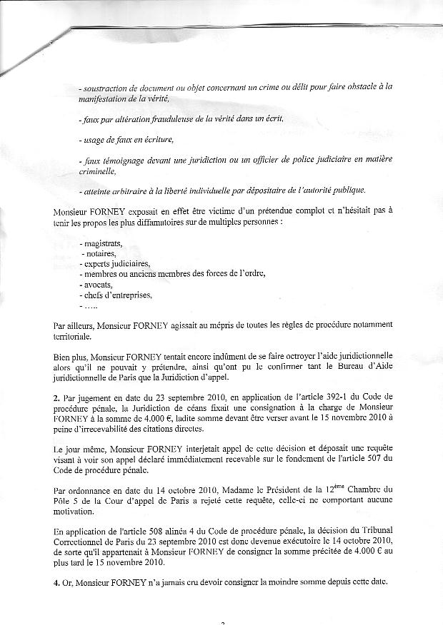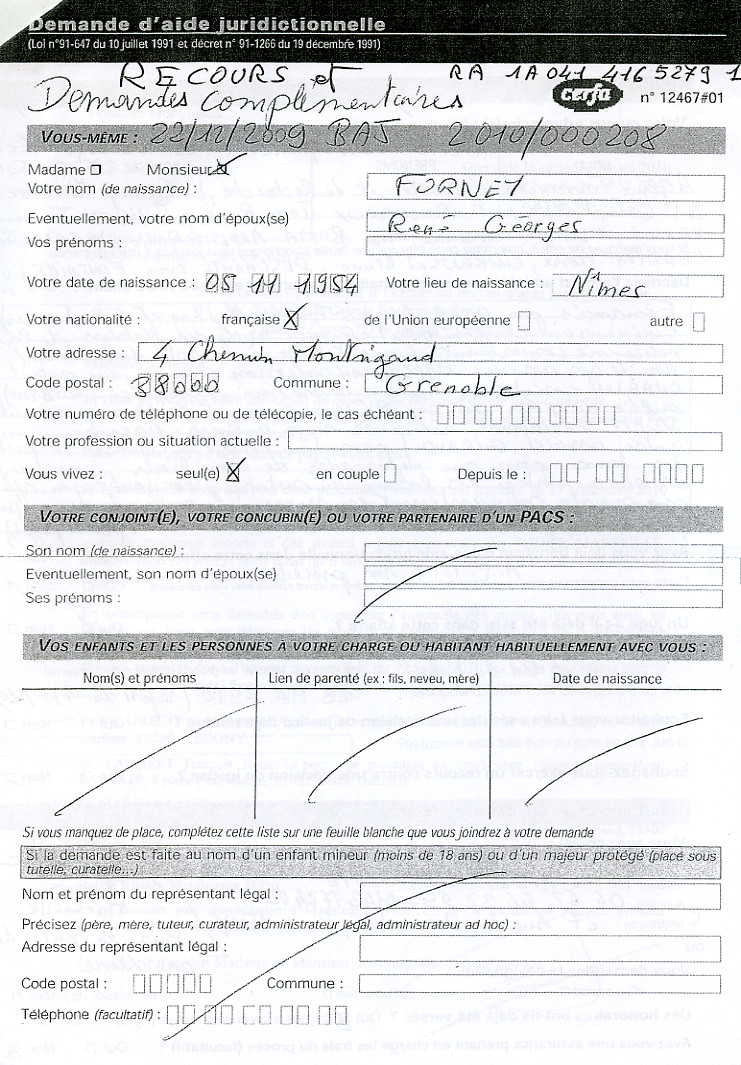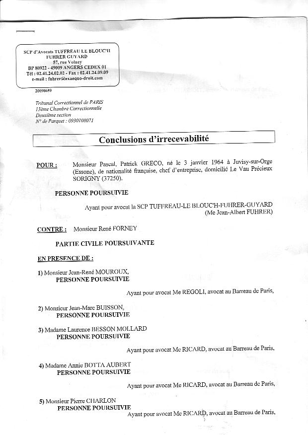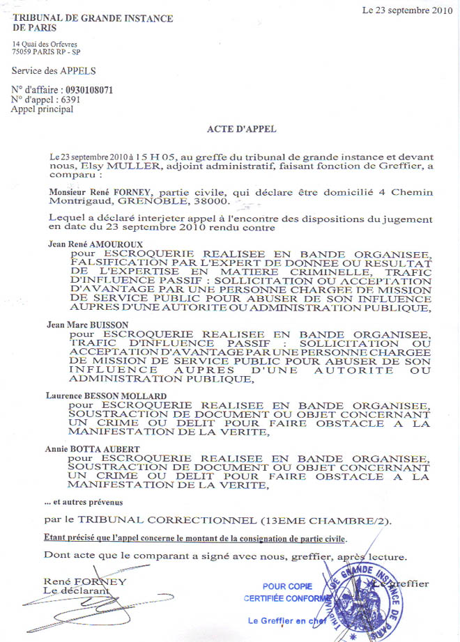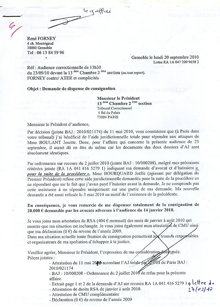 René FORNEY, 4 ch. Montrigaud, 38000 Grenoble Grenoble le jeudi 21 octobre 2010 Objet : Mise sous séquestre ou autre mesure en urgence. Tribunal Correctionnel - 13 ème chambre, 2 section - 4 Bd du Palais, 75004 PARIS À Monsieur Olivier GERON, Président de l'audience correctionnelle du 23 sept. 2010. Motif de l'intervention A - Par décision en audience du 23 septembre 2010 devant la 13 e Chambre 2 e Section du Tribunal correctionnel de Paris, Monsieur le juge GERON Olivier a fixé une consignation à 4.000 € à verser avant le 15 novembre 2010 (Affaire N° 0930108071) malgré ma situation au RSA depuis plusieurs années, malgré mes justificatifs (pièce 201) de 400 € de revenu mensuel . De plus, Monsieur le juge GERON me demande de faire citer à nouveau les absents pour le report au 3 février 2011. B - Je réaffirme être dans l'impossibilité de verser, avant le 15 novembre, cette consignation avec mes moyens connus à ma disposition car ma liquidation de communauté est toujours pendante devant la Cour d'appel de Grenoble (pièce 202).