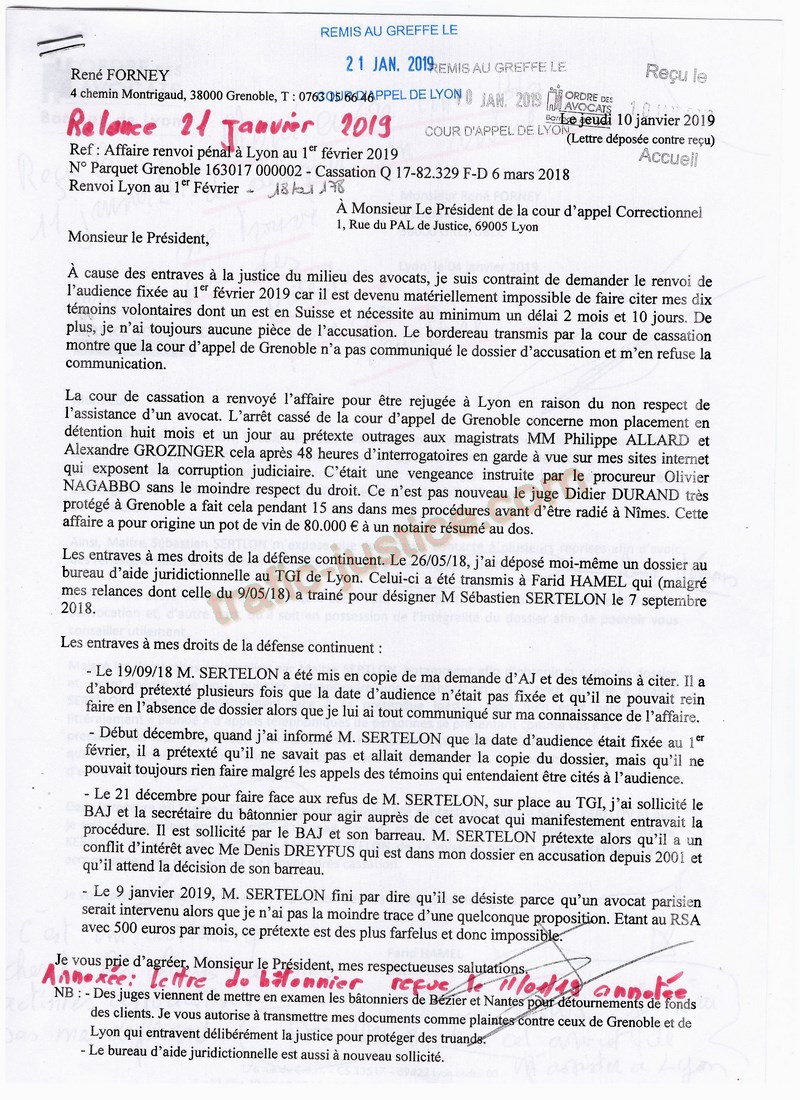 Accueil UNE JUSTICE GANGRENÉE PAR LA CORRUPTION en réseaux Pour assister René FORNEY et rejuger à Lyon le 1/02 (renvoyé au 20/05 puis au 18/11/19 9e Ch.) à la cour d'appel, sollicité par l'aide juridictionnelle totale pour désigner un avocat, le bâtonnier Farid HAMEL