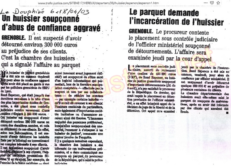 14 - Détournements de fonds de l'huissier René ESPENON- Dauphiné Libéré des 6 et 8 avril 2003.