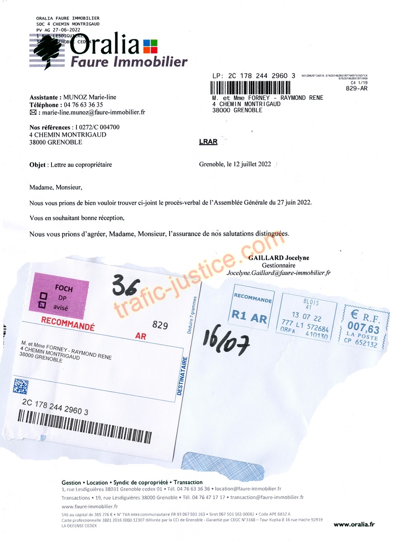 Le procès-verbal de cette assemblée (pièce 21) a été envoyé en recommandé daté du 13 juillet 2022 (RA 2C1782429603), présenté le 16 juillet par la poste à M. FORNEY au 4 chemin Montrigaud à Grenoble.