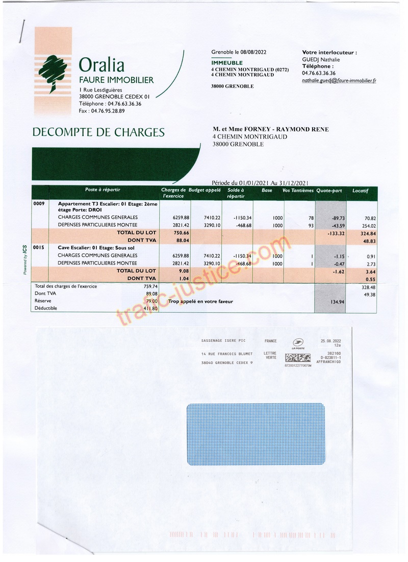 Sur le relevé de comptes (pièce 11) du syndic (annoté) du 9 avril 2021, remarquez que le compte de charges dues au 10 juil. 2018 est à zéro – 6 mois plus tard (01 janv 2019) l'appel de fonds de 414,85 € est suivi 3 semaines après !!! (25 janv 2019) de procédures de recouvrement ! Pourquoi cette urgence ? Parce qu'ils savaient tous leurs envois à une fausse adresse (pièce (12) ou (C) et que M. FORNEY ne pourrait donc en avoir connaissance. Depuis 1999 le syndic envoie les convocations aux AG à M. FORNEY à son adresse actuelle (pièces 23 ou L) !