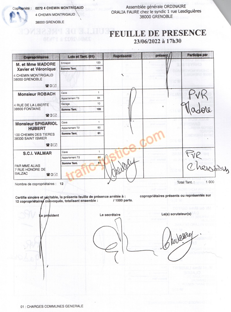 Obtenue le 12 août 2022, une feuille de présence (pièce 19) donne les noms et adresses des 12 copropriétaires . Elle est émargée par les quatre copropriétaires présents, les trois membres du conseil syndical ( Chrystelle CHEVASSUS, Cataldo CIMADOMO, Véronique MADORE ) et René FORNEY [79voix], deux agissant en tant que mandataires ( Chrystelle CHEVASSUS : 1 pouvoir 89+61=150voix et Véronique MADORE : 2 pouvoirs 123+79+105=307voix ou tantièmes) représentant trois copropriétaires absents (Mme ALIAS SCI VALMAR, Eric LEPRINCE et ROBACH) ; un copropriétaire (Daniel GUYOT 79 voix) a voté par correspondance ; les quatre autres copropriétaires ne se sont pas manifestés (DANDRES SCI ECM, FERRAZZI GOUMAS, Claude LIMBERT, Hubert SPIGARIOL 105+79+79+61=324voix). Cette feuille de présence établit que les copropriétaires présents ou représentés détiennent ensemble 676 voix (ou tantièmes) sur 1000 tantièmes.