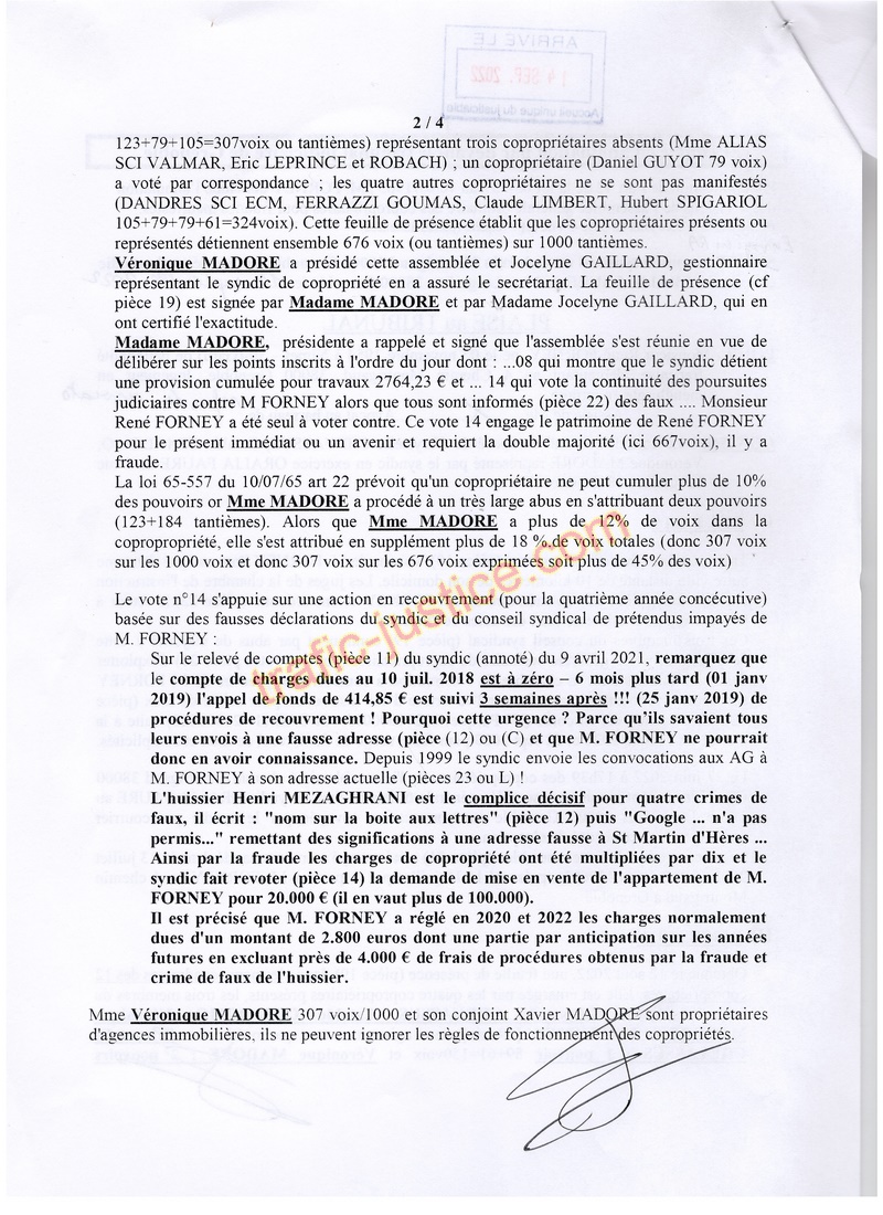 Madame MADORE, présidente a rappelé et signé que l'assemblée s'est réunie en vue de délibérer sur les points inscrits à l'ordre du jour dont : ...08 qui montre que le syndic détient une provision cumulée pour travaux 2764,23 € et ... 14 qui vote la continuité des poursuites judiciaires contre M FORNEY alors que tous sont informés (pièce 22) des faux .... Monsieur René FORNEY a été seul à voter contre. Ce vote 14 engage le patrimoine de René FORNEY pour le présent immédiat ou un avenir et requiert la double majorité (ici 667voix), il y a fraude.