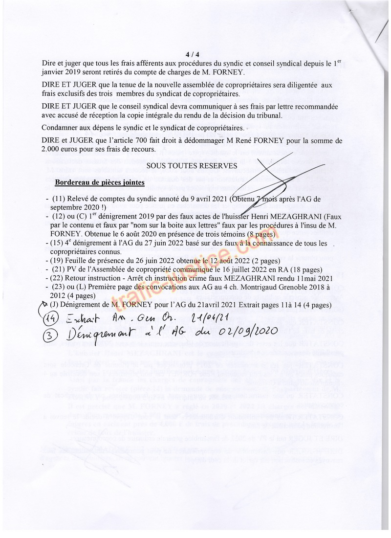 Ces trois membres du conseil syndical (pièce 19) continuent p ar abus de majorité à cette dernière assemblée générale ordinaire de copropriétaires (voir les votes pièce 21) d'exploiter des significations dont la chambre de l'instruction a considéré les preuves de M FORNEY suffisament probantes pour ordonner l'ouverture d'une instruction pour crime de faux (pièce 22). L'instruction est en cours ( N° Parquet 20241000015 - JI CAB JI4 21000028) suite à la plainte du 11 août 2020 et 22 sept 2020 pour faux, usage de faux, recel de faux et complicités.