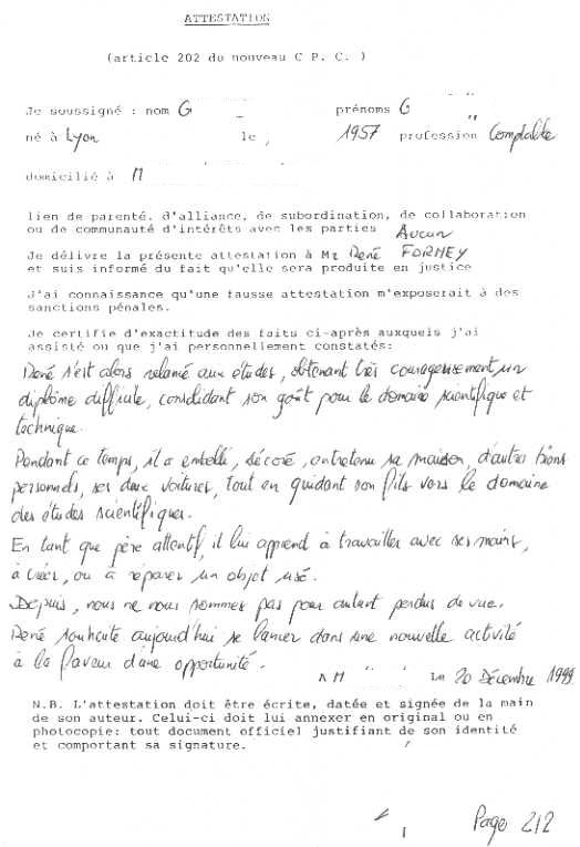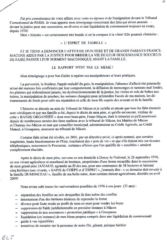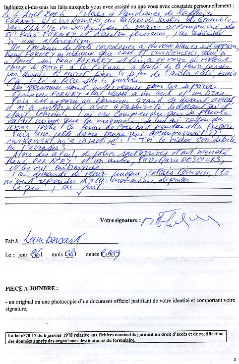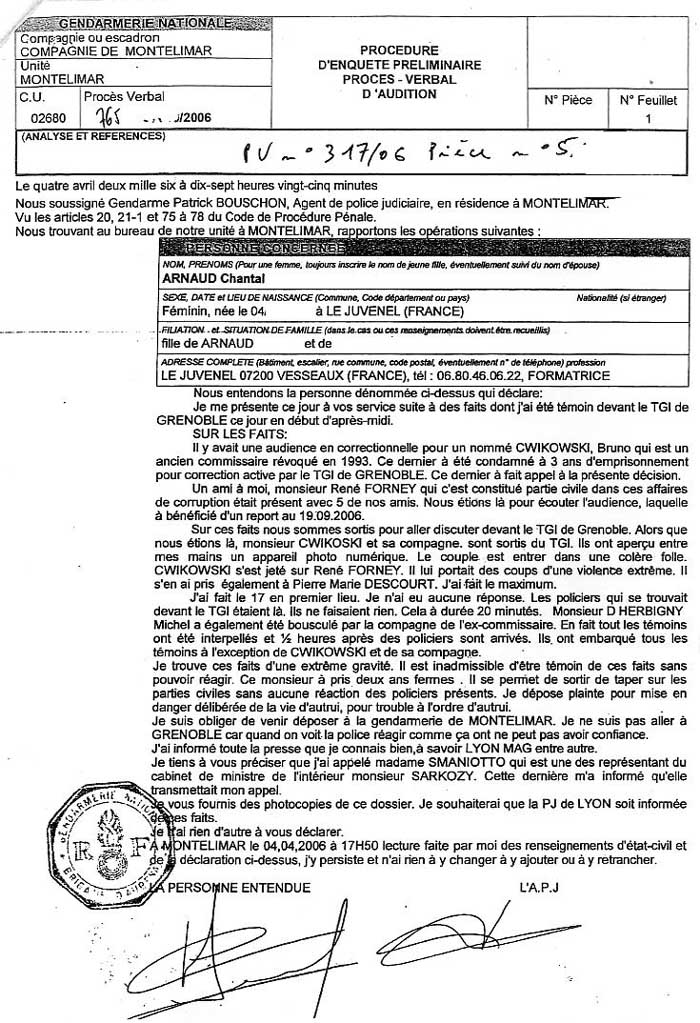 Dans la citation : voir - Mme ARNAUD dépose à 150 km, 3h après l'agression de CWIKOWSKI pendant que ce dernier faisait mettre pour 48h en garde à vue sa victime (Pièce dans les autres procédures : voir) Mme JEAUGEY - Voir pièce 14 (Pièce cette procédure voir) Témoignage de M SCHULZ - Voir pièce 41 (Pièce cette procédure voir) |