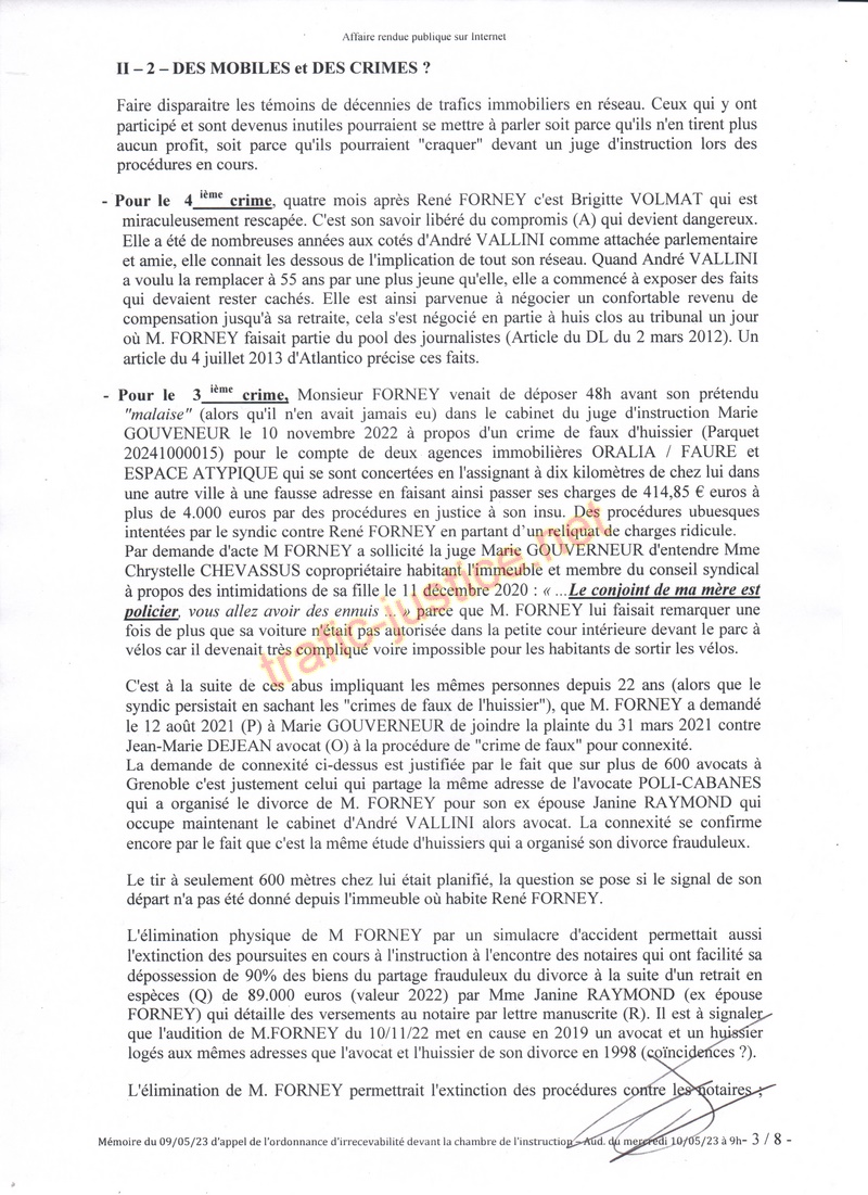 - Pour le 3 ième crime, Monsieur FORNEY venait de déposer 48h avant son prétendu "malaise" (alors qu'il n'en avait jamais eu) dans le cabinet du juge d'instruction Marie GOUVENEUR le 10 novembre 2022 à propos d'un crime de faux d'huissier (Parquet 20241000015) pour le compte de deux agences immobilières ORALIA / FAURE et ESPACE ATYPIQUE qui se sont concertées en l'assignant à dix kilomètres de chez lui dans une autre ville à une fausse adresse en faisant ainsi passer ses charges de 414,85 € euros à plus de 4.000 euros par des procédures en justice à son insu. Des procédures ubuesques intentées par le syndic contre René FORNEY en partant d'un reliquat de charges ridicule.