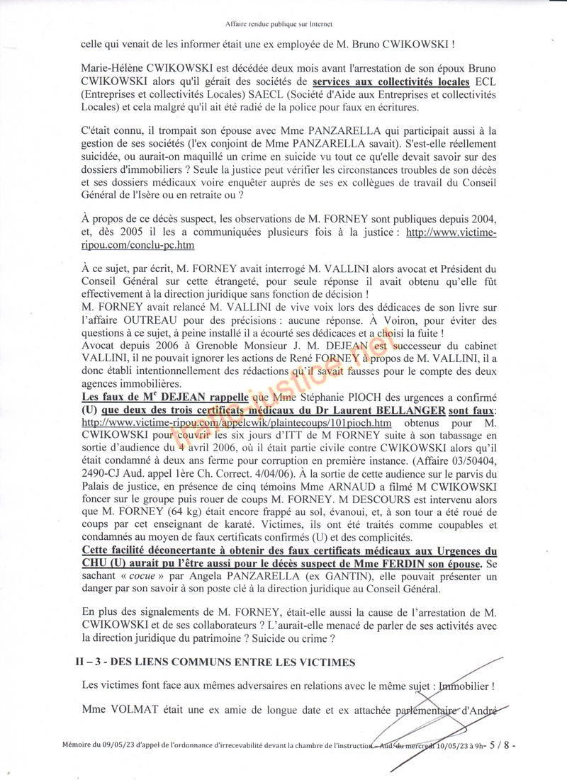 « ... Cette tentative d'assassinat s'est produite le samedi 12 novembre dernier, 48h après la sortie de mon audition du 10 novembre devant la juge d'instruction Marie GOUVERNEUR au sujet de deux agences immobilières de Grenoble (ORALIA-FAURE et ESPACE ATYPIQUE)... »