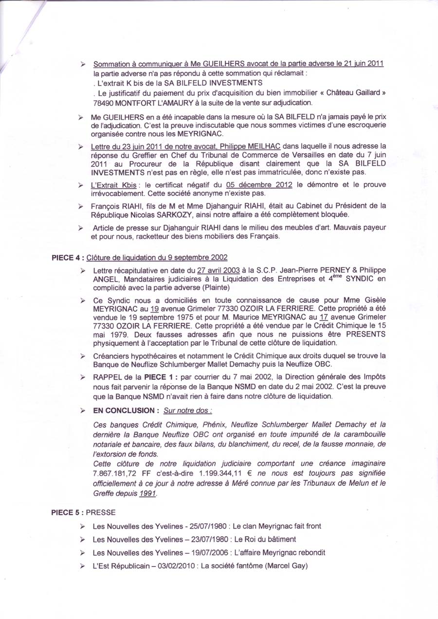 Par ailleurs, Me MEILHAC nous a écrit dans une correspondance que M. Michel DESPLAN, Procureur de la République et maintenant Procureur général à Nîmes, lui a confirmé que le Greffe lui avait signalé que SA Bilfeld Investments Incorporated n'a jamais été immatriculée à Versailles. C'est une preuve formelle.