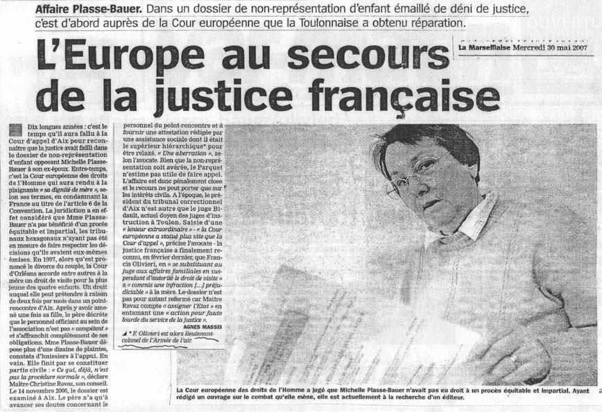 Une affaire où les intérêts de l'enfant sont bafoués comme pour des millions de pères et de mères en France Source : La Marseillaise du mercredi 30 mai 2007 par AGNES MASSEZ - la suite (Voir aussi article de Var-matin, et site Internet ) |