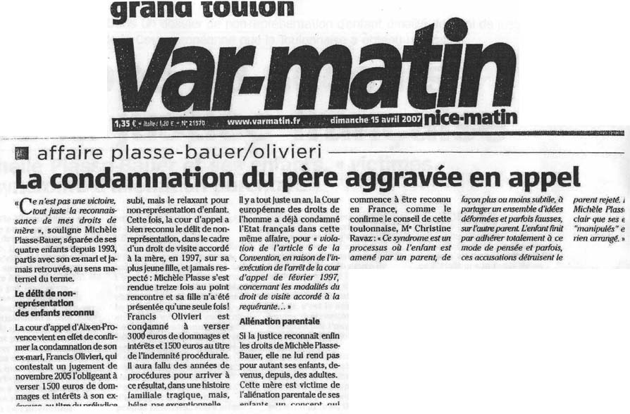 Une affaire où les intérêts de l'enfant sont bafoués comme pour des millions de pères et de mères en France Source : VAR - MATIN du 15 avril 2007 Voir aussi article de La Marseillaise, et site Internet ) |