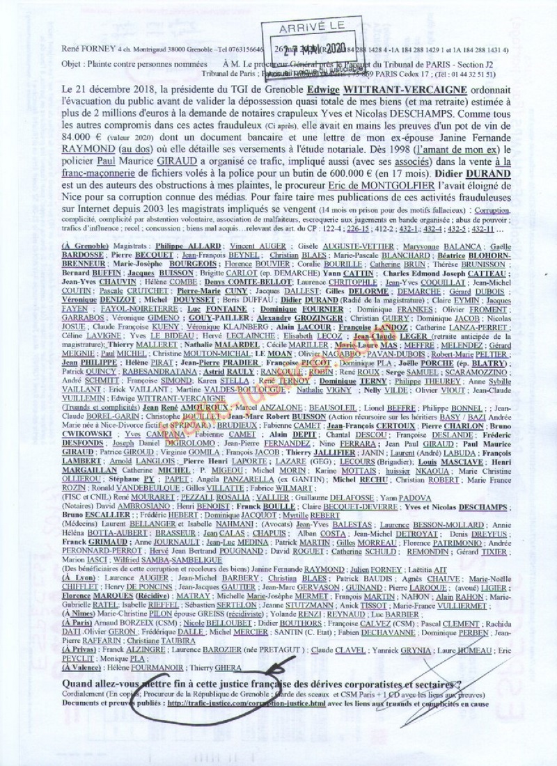 Le 21 décembre 2018, la présidente du TGI de Grenoble Edwige WITTRANT-VERCAIGNE ordonnait l'évacuation du public avant de valider la dépossession quasi totale de mes biens (et ma retraite) estimée à plus de 2 millions d'euros à la demande de notaires crapuleux Yves et Nicolas DESCHAMPS. Comme tous les autres compromis dans ces actes frauduleux (Ci après), elle avait en mains les preuves d'un pot de vin de 84.000 € (valeur 2020) dont un document bancaire et une lettre de mon ex-épouse Janine Fernande RAYMOND ( au dos ) où elle détaille ses versements à l'étude notariale. Dès 1998 ( l'amant de mon ex ) le policier Paul Maurice GIRAUD a organisé ce trafic, impliqué aussi (avec ses associés ) dans la vente à la franc-maçonnerie de fichiers volés à la police pour un butin de 600.000 € (en 17 mois). Didier DURAND est un des auteurs des obstructions à mes plaintes, le procureur Eric de MONTGOLFIER l'avait éloigné de Nice pour sa corruption connue des médias. Pour faire taire mes publications de ces activités frauduleuses sur Internet depuis 2003 les magistrats impliqués se vengent (14 mois en prison pour des motifs fallacieux) : Corruption , complicité, complicité par abstention volontaire, association de malfaiteurs, escroquerie aux jugements en bande organisée ; abus de pouvoir ; trafics d'influence ; recel ; concussion ; biens mal acquis…relevant des art. du CP : 122-4 ; 226-15 ; 412-2 ; 432-1 .; 432-4 ; 432-5 ; 432-11 …