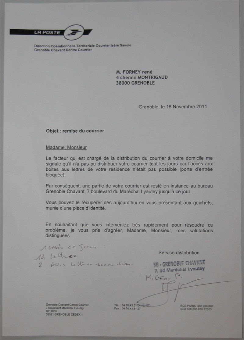 Le vendredi 11 novembre j'ai téléphoné puis me suis rendu à la poste Chavant au 7 bd Maréchal Liautey à Grenoble pour savoir où étaient mes courriers manquants. Le lundi 14 j'apprenais au guichet que certains de mes courriers n'avaient pas été distribués au motif que le digicode de l'immeuble ne fonctionnait pas, et, que je pouvais prendre mes courriers. J'ai refusé de le faire dans un premier temps car le receveur était dit ? absent " et personne ne voulait me remettre de justificatif par écrit. Je suis revenu en présence de témoins deux fois, et, au troisième jour le 16 novembre Monsieur P. MIGEOU a accepté de me faire un reçu remis en main propre qu'il a annoté à ma demande, et, a tamponné mes 16 courriers à la date du jour de la remise (le 16/11/11). J'ai ainsi emporté mes 14 courriers et deux avis de recommandés envoyés du 7 octobre au 8 novembre 2011, et, non distribués (pièces 1 et 2) avec des retards s'étalant sur cinq semaines !