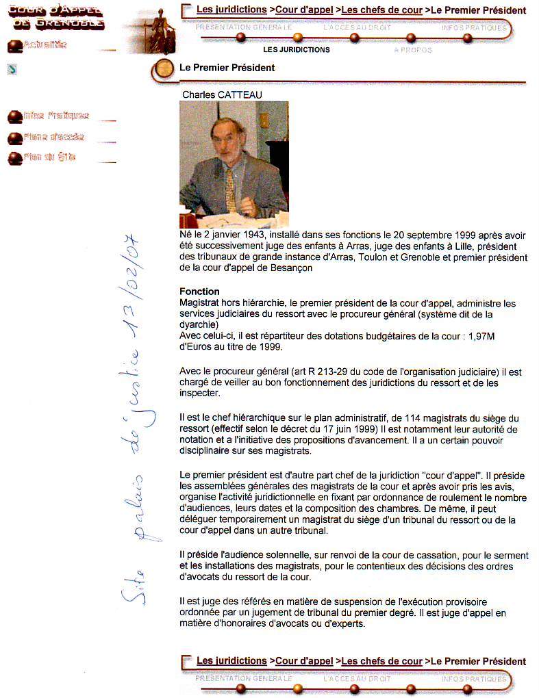 UNE CRAPULE DE LA JUSTICE M CATTEAU Charles Joseph : page du site du palais de justice au 13 février 2007 Mouvements et photos du /11/02 2/09/05 23/02/05 701/06 3/03/06 15 juillet 2006 Jean-Michel COUTIN 15/11/07 juillet 2008 janv.2009 nov.2009 ... 2016 ? BEYNEL PAUL- MICHEL ? 2017 ... 2024