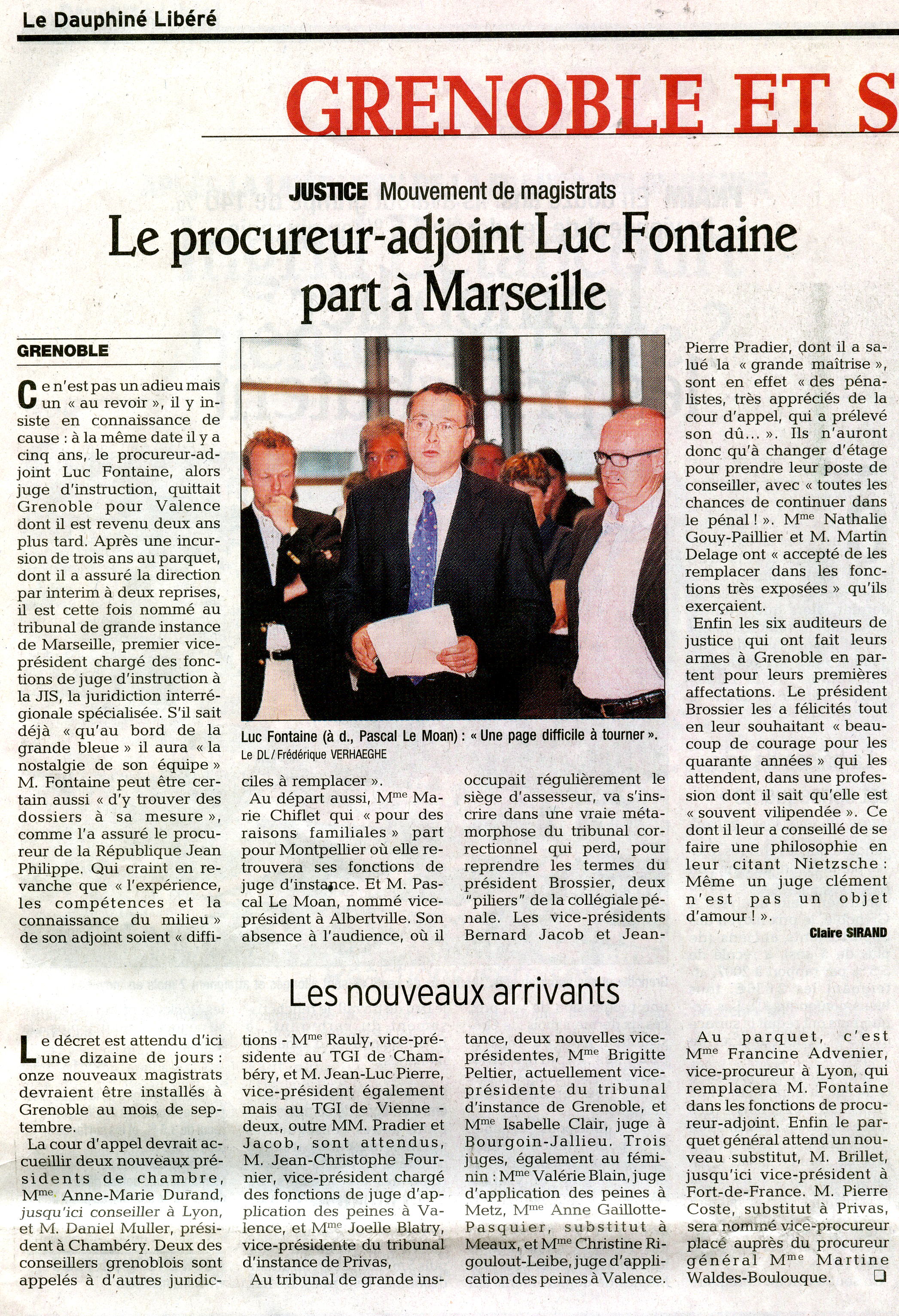| Ce n' est pas un adieu mais un « au revoir », il y insiste en connaissance de cause : à la même date il y a cinq ans, le procureur-adjoint Luc Fontaine, alors juge d'instruction, quittait Grenoble pour Valence dont il est revenu deux ans plus tard. Après une incursion de trois ans au parquet, dont il a assuré la direction par interim à deux reprises, il est cette fois nommé au tribunal de grande instance de Marseille, premier vice-président chargé des fonctions de juge d'instruction à la JIS, la juridiction interrégionale spécialisée. S'il sait déjà « qu'au bord de la grande bleue » il aura « la nostalgie de son équipe » M. Fontaine peut être certain aussi « d'y trouver des dossiers à sa mesure », comme l'a assuré le procureur de la République Jean Philippe. Qui craint en revanche que « l'expérience, les compétences et la connaissance du milieu » de son adjoint soient | Le procureur-adjoint Luc Fontaine |