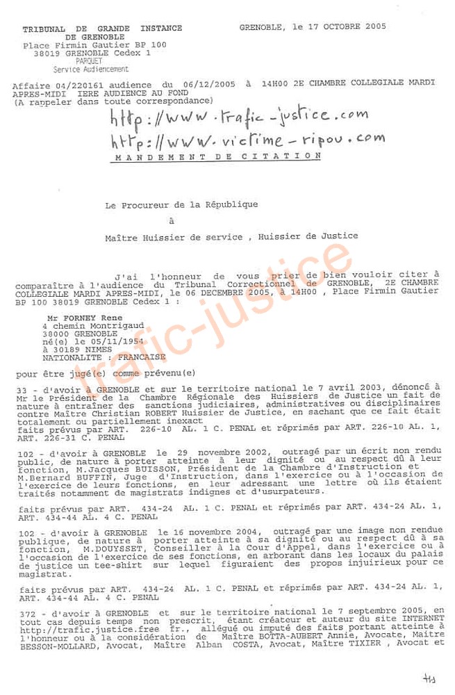 Assignation en correctionnelle 1 , 2 , 3 Dénonce au ministre de la justice Relance à Mme Valdès-Boulougue