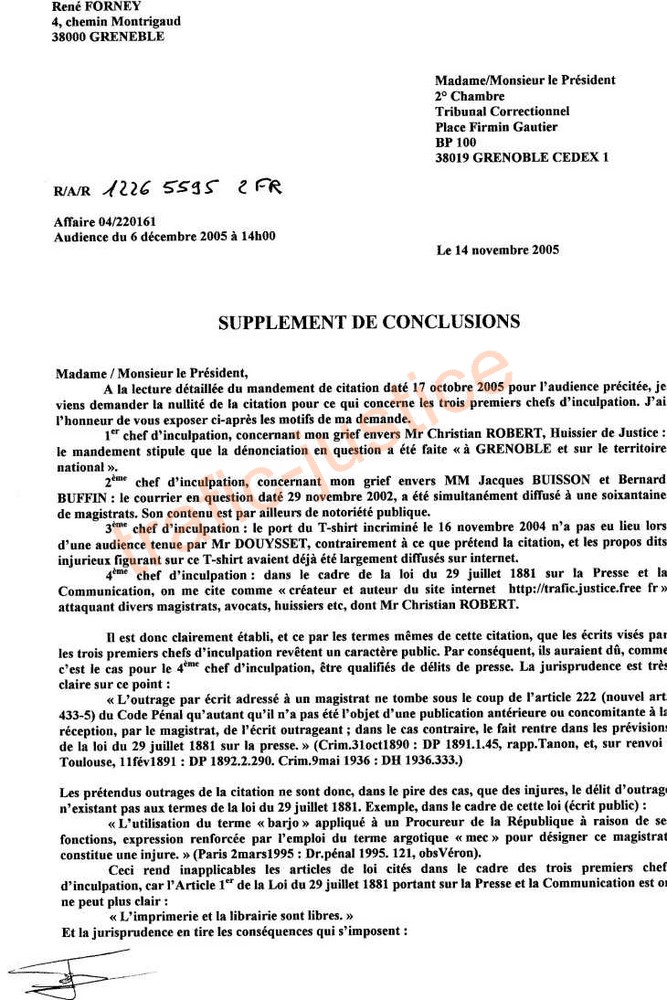 Ces conclusions répondent aux accusations d'outrages, alors que, tout n'est que publications indispensables à la manifestation de la vérité que 7 témoins cités viendront confirmer à l'audience. Suite page 2