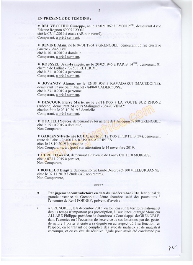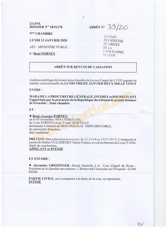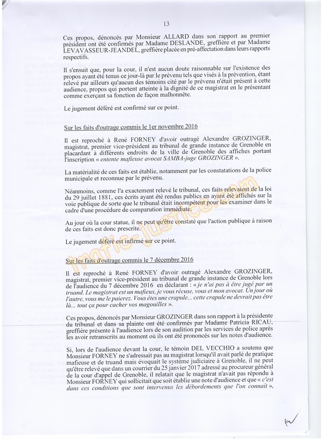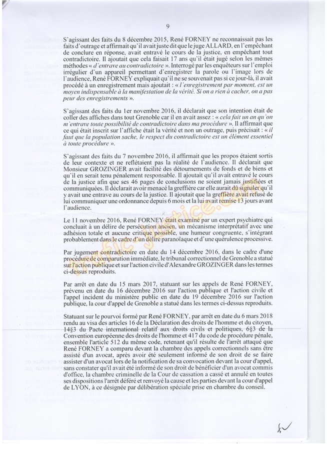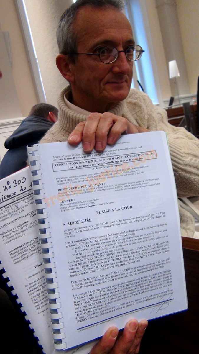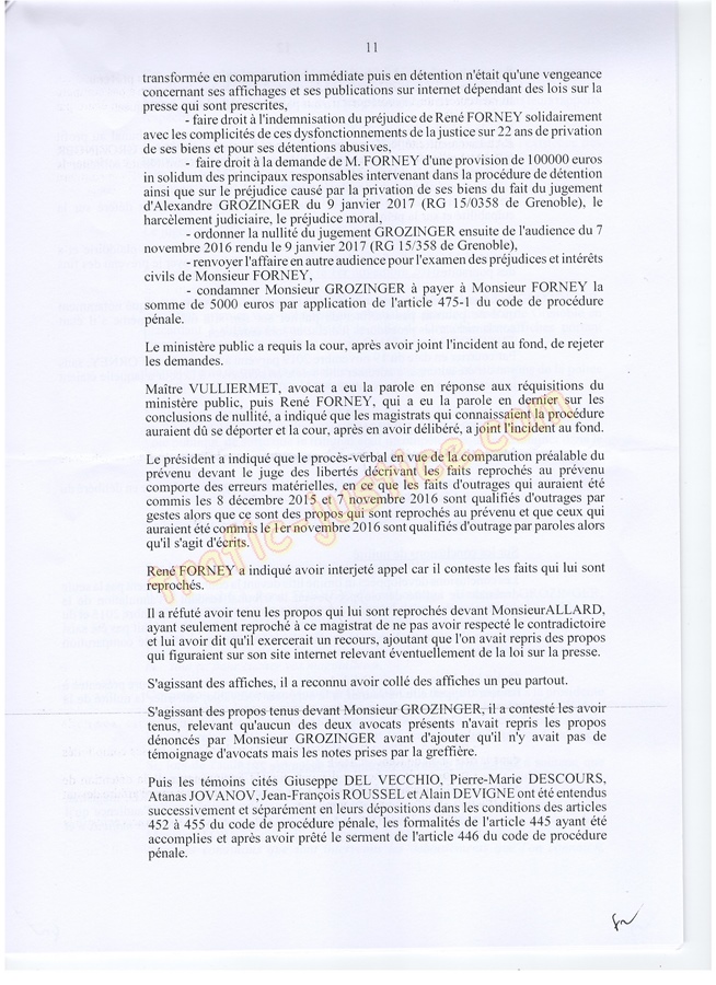 Les 2 juges mafieux protégés accusateurs d'outrages GROZINGER et ALLARD n'étaient ni présents ni représentés ni n'avaient produit des conclusions pour leur défense. Résultats un simulacre d'audience pour rejuger : Fausses accusations, faux PV de police, refus d'audition des témoins, non respect du code de procédure pénale (pas d'avocat, comparution immédiate pour du délit de presse, les mêmes juges du fond et des libertés JLD...) = 8 mois en détention arbitraire en 2016/2017 en récidive de 6 en 2014 - Après cassation les juges de Lyon (déjà intervenu pour un autres jugement) complices et corrompus avec leur avocat désigné confirme ci-dessous.