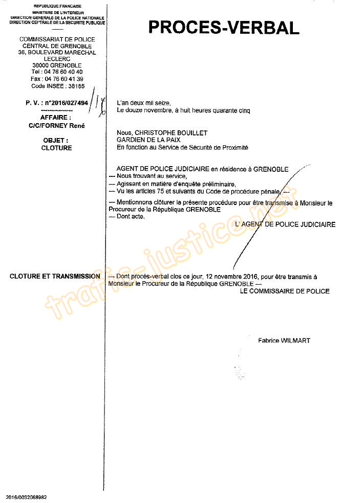 | Accueil Le 10/11/16 : 8 mois encore un fois en prison avec des faux PV d'une accusation vide remis par la cour de LYON en 2019 Ici le commissaire divisionnaire Fabrice WILMART valide l'empilage de faux établis par Stéphane PY (policier à Grenoble) Oliver NAGABBO le procureur a caché, ces documents à la Cour de cassation qui a reconnu les méthodes illégales sans avocat de mise en détention de René FORNEY aux prétextes "outrages" pour se venger de ses publications du pot de vin de 83.000 euros (valeur 2019) versés aux notaires de l'étude Yves Nicolas Olivia DESCHAMPS à St Egrèves pour organiser la dépossession de René FORNEY Ces faussaires sont tous passibles du CP 432-4 (30 ans de prison) Témoignez à René FORNEY 07 63 15 6646 |