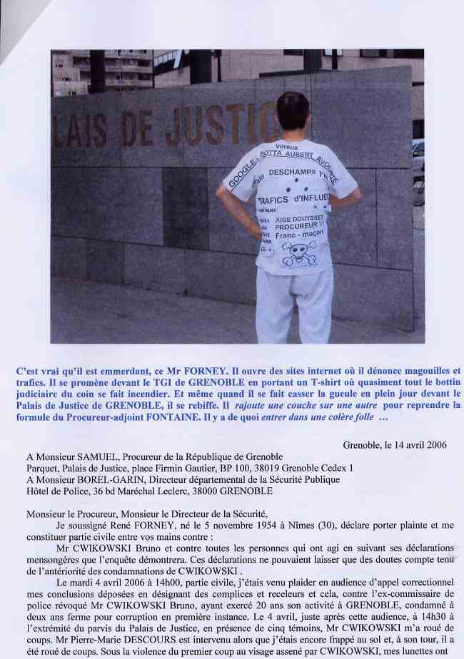 trafics. Il se promène devant le TGI de GRENOBLE en portant un T-shirt où quasiment tout le bottin