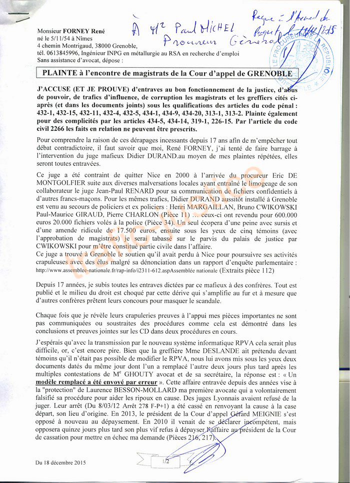 PLAINTE à l'encontre de magistrats de la Cour d'appel de GRENOBLE