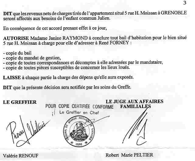 | Ce jugement, du 9 mai 2006, me dépossède de la demi part des loyers qui me revient. Il est rendu à huis clos par le juge PELTIER Robert-Marie passé aux affaires familliales (JAF), c'est lui (juge des libertés en 2004) qui a remis en liberté CWIKOWSKI après 4 mois de détention Partie civile, mes dénonciations contre le barbouse de la République commissaire révoqué Bruno CWIKOWSKI dérangent et M PELTIER me sanctionne. Au RMI, l'Aide Juridictionnelle m'est refusée pour me barrer l'accès à une formation collégiale en appel. L'avoué M POUGNAND Hervé Jean Bertrandrefuse depuis trois mois de communiquer mes conclusions. |