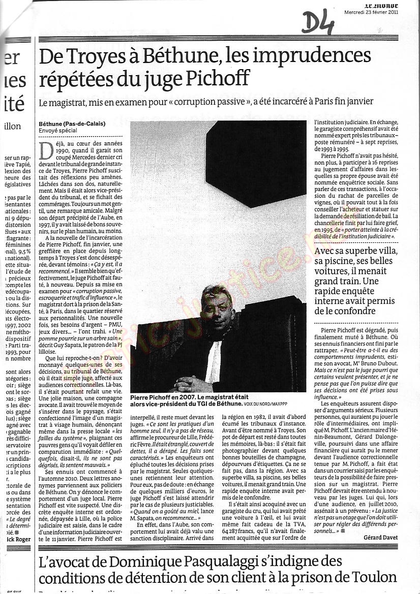 « . juge Pichoff. Le magistrat, mis en examen pour "corruption". en échanges de quelques milliers d'euros le juge Pichoff s'est laissé attendrir par le cas de plusieurs justiciable. » (D4)