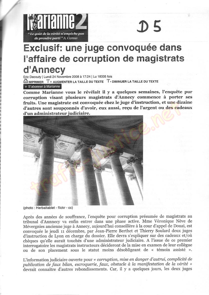 « Une juge convoquée dans l'affaire de corruption de magistrats d'Annecy. reçu de l'argent ou des cadeaux d'un administrateur judiciaire » (D5)