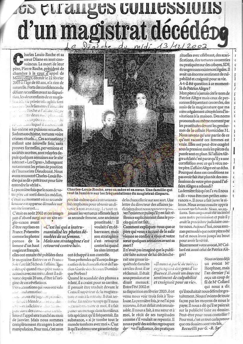 « . confessions d'un magistrats décédés Pierre ROCHE.C'est lui qui a instrumentalisé les photos dénudées de sa femme. Mais son stratagème s'est retourné contre lui.se disait menacé à l'été 2002 et sa disparition en février 2003. » (D9)