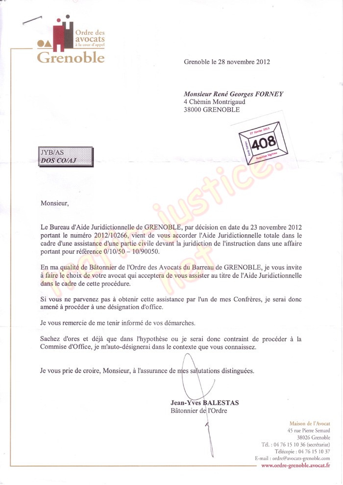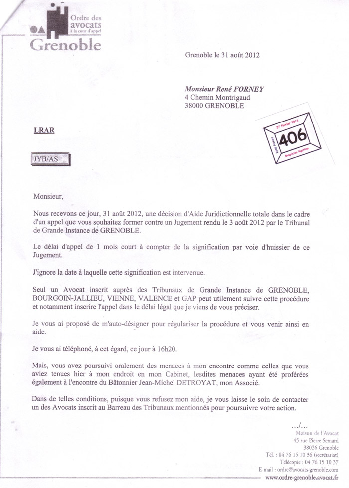 « Je vous rappelle qu'aucun avocat de GRENOBLE n'accepte aujourd'hui d'intervenir à vos côtés au titre de l'aide juridictionnelle »