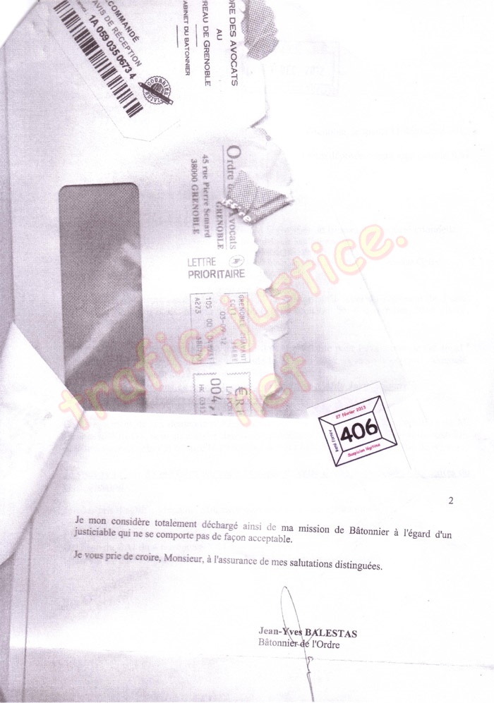 Monsieur le Bâtonnier m'a écrit (p. 406 et 407) le 31 août 2012 et le 29 janvier 2013 :