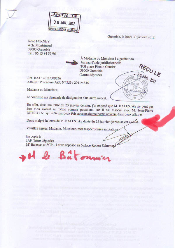 n° 410 - Lettres de récusation à Me BALESTAS du 23 janvier 2012 et 30 janvier 2012