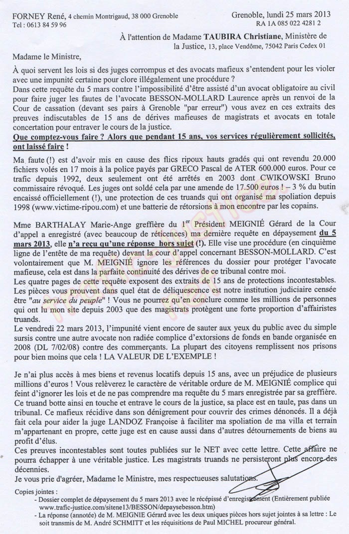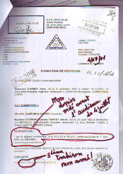 - Où la cession de mes biens par des actes authentiques est établie par des notaires à mon insu. Cela est maintenant prouvé par les actes récupérés aux hypothèques en mars 2010 dont un est signé par René PROBY maire de St Martin d'Hères le 14 octobre 2008, soit datés avant les jugements de partage de la communauté ! À partir de faux et de trafics d'influence, Mme RAYMOND ex-FORNEY délivrant pendant quinze ans des permis de construire en mairie est, avec 38.000 € (soustrait de la communauté), devenue propriétaire de biens immobiliers volés à deux propriétaires Mme MINGAUD Françoise et moi-même FORNEY René.