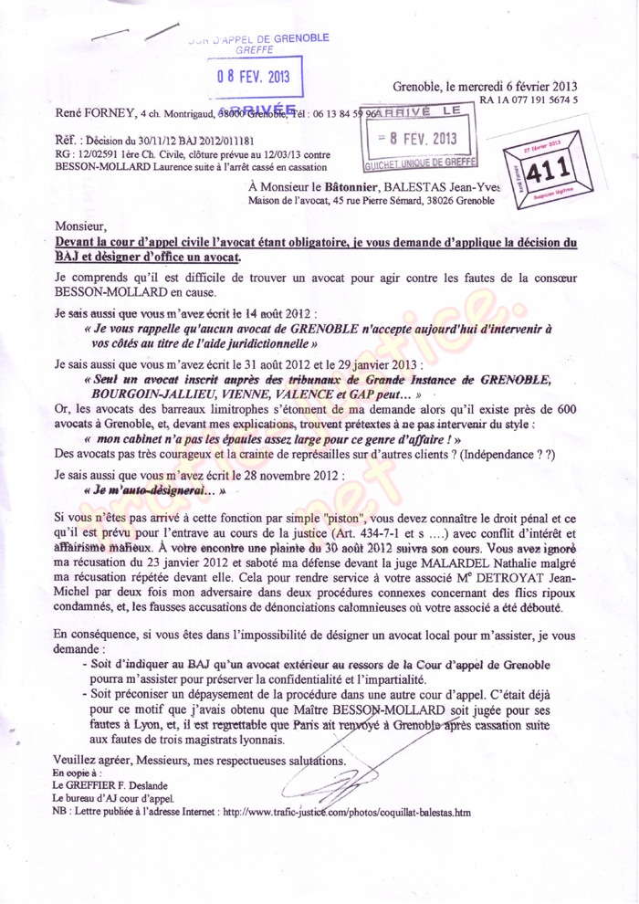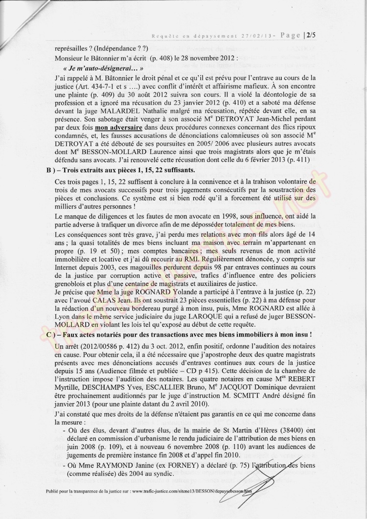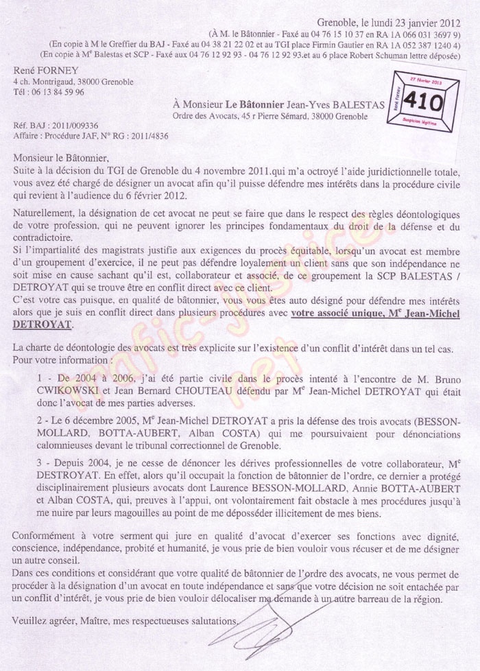 J'ai rappelé à M. Bâtonnier le droit pénal et ce qu'il est prévu pour l'entrave au cours de la justice (Art. 434-7-1 et s ..) avec conflit d'intérêt et affairisme mafieux. À son encontre une plainte (p. 409) du 30 août 2012 suivra son cours. Il a violé la déontologie de sa profession et a ignoré ma récusation du 23 janvier 2012 (p. 410) et a saboté ma défense devant la juge MALARDEL Nathalie malgré ma récusation, répétée devant elle, en sa présence. Son sabotage était pour venger à son associé Me DETROYAT Jean-Michel perdant par deux fois mon adversaire dans deux procédures connexes concernant des flics ripoux condamnés, et, les fausses accusations de dénonciations calomnieuses où son associé Me DETROYAT a été débouté de ses poursuites en 2005/ 2006 avec plusieurs autres avocats dont Me BESSON-MOLLARD Laurence ainsi que trois magistrats alors que je m'étais défendu sans avocats. J'ai renouvelé cette récusation dont celle du 6 février 2013 (p. 411)
