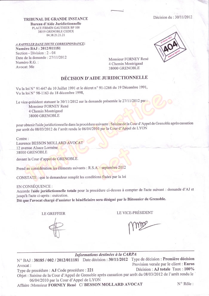 n° 404 - Décision d'AJ totale du 30/11/12 (BAJ 2012/011181)