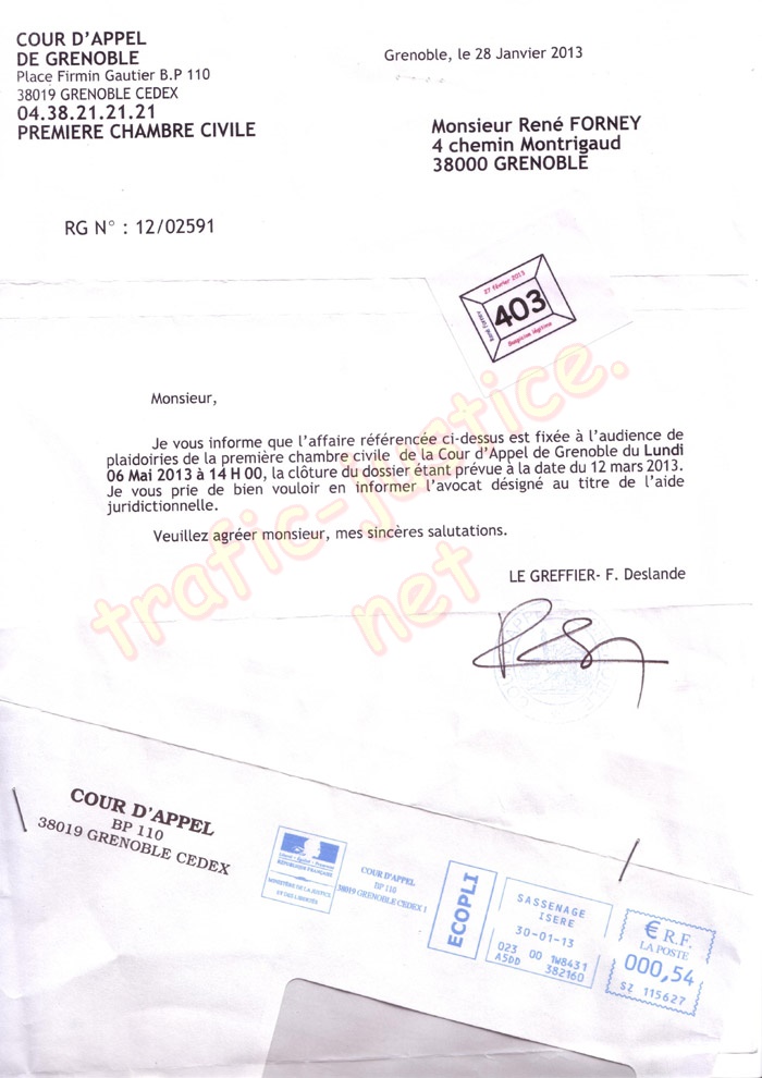 n° 403 - Lettre du 28 janvier 2013 de la Cour d'appel 1ère chambre civile RG : 12/02591
