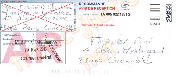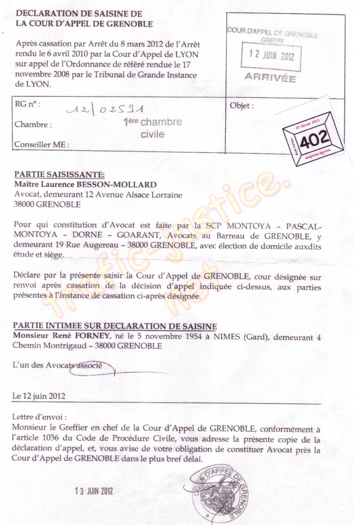 En appel, les trois juges lyonnais STUTZMANN Jeanne, Mme CHAUVE Agnès, Mr LAROQUE Pierre ont refusé de juger en violant des textes de lois. La Cour de cassation confirmera en cassant l'arrêt (278 F-P+I) de ces trois juges (p. 401) en audience du 8 mars 2012. La Cour renverra l'affaire devant la juridiction grenobloise pour y être jugée, cela par erreur car le dépaysement initial était à cause des difficultés à constituer avocat de même barreau à Grenoble.