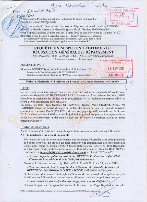 Objet : Impossibilité d'être assisté d'un avocat obligatoire, demande de dépaysement du tribunal de Grande Instance de Grenoble